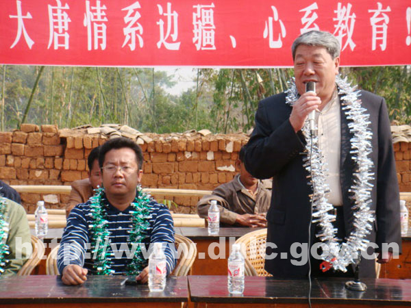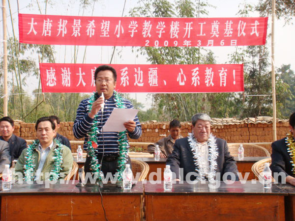 县长李正环在欢迎辞中对大唐国际电力有限公司的义举表示热烈的欢迎和衷心的感谢。他在讲话中说,中国大唐国际云南分公司为了支持边疆教育发展,提高民族教育水平,改善我县小学的办学条件,于2007年捐资50多万元建盖陇川县陆坤小学教学楼。2008年“8•20”、“8•21”地震后,大唐公司十分关心陇川受灾情况,决定再次捐资90.8万元,用于援建帮景小学教学楼。大唐国际电力有限公司的此举将对陇川教育事业的发展起到积极的推动作用。他要求帮景小学全校师生要以这次捐赠为契机,积极工作,努力学习,促进学校教育教学质量的提高。并希望今后与大唐国际电力有限公司在更广阔的领域开展更密切的合作。