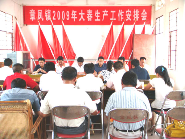 2009年章凤镇大春生产以农业增效、农民增收、农村稳定为目的,加大种植结构调整力度,计划完成农作物播种面积4.37万亩,其中:粮豆作物4.26万亩,预计产量14400吨,优质稻种植面积为2.4万亩;油料作物0.01万亩,总产15吨;蔬菜计划面积0.1万亩,总产850吨;渔业计划养殖面积0.83万亩,预计总产849吨。同时结合各村委会实际,对种植任务进行细化安排。