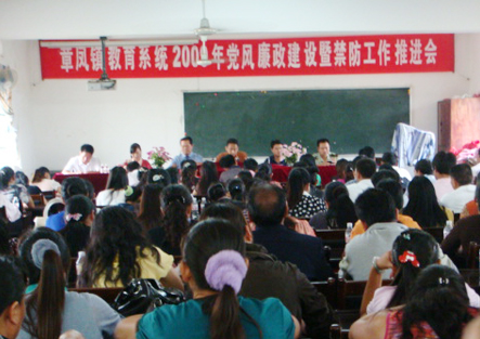 章凤镇镇长赖正张对全体教师取得的教学成绩做了充分肯定,并对教师做出的努力表示感谢;章凤镇其他领导分别做了党风廉政建设、预防职务犯罪、禁毒防艾知识方面的讲座;章凤边防派出所所长曹勇,通报了半年来全镇禁毒防艾的情况;镇禁防办发放了452份宣传资料,并对全体教职工进行了问卷调查。 章凤镇党委书记刘永全要求全体教师要以身作则、为人师表、遵纪守法、不断学习,加强基层党组织活动,充分发挥党员的先锋模范作用。这次会议取得了良好的宣传教育效果。