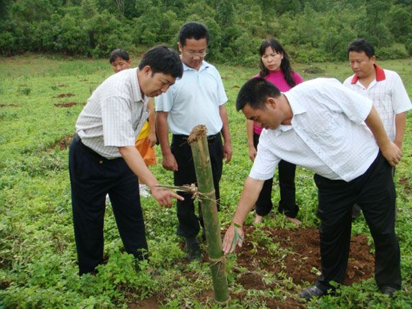 通过走访农户、实地调研后,李正环对竹基地建设取得了成绩给予肯定,并就存在的问题提出了明确要求。他指出,从目前来看,示范基地投入力度不够,管理经营相当粗放,大部分竹农信心和决心不足。县委、县政府决定进一步做好竹子示范基地,一方面是要起到示范带头作用,便于总结成功经验,改进不足,以此扩大以点带面的作用;另一方面,林业部门要发挥部门优势,集中管理,提高竹苗成活率,在技术上全程对竹农进行服务指导,从整个技术流程上认真规范化起来;再一方面,要使持等待、观望、信心不足的竹农认识到县委、县政府发展竹子的决心,把帐算清给竹农,提高竹农种植信心。就下一步工作,李正环要求,要通过龙头企业带动,在每个乡镇都建立丰产竹林示范基地,采用科学的集约经营方式,确保示范基地领导、资金、林地、技术、管理五个到位,进一步增强竹农发展竹产业的信心和决心,以此全面推动全县竹产业的全面发展,使竹产业尽快成为我县继蔗糖产业之后又一重要产业。