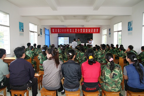 下午,来自县人武部的官兵给小营员进行了简单的国防知识讲座。讲座主要围绕军事隐身技术、现代军事飞机的主要机型和特性展开,全体小营员还观看了汶川地震抗震救灾英模事迹报告会。