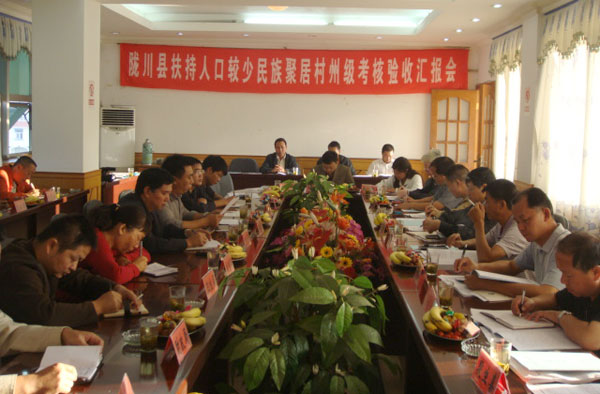 26日上午,考核验收组组织召开了陇川县扶持人口较少民族聚居村州级考核验收汇报会,李益民副县长就陇川县扶持人口较少民族发展情况进行了汇报。经过实地检查、查阅痕迹资料和听取汇报后,考核验收组充分肯定了陇川县扶持人口较少民族发展工作,认为在实地走访中看到人口较少民族地区经济发展,民族团结,到处呈现欣欣向荣的景象,工作取得明显成效,在工作中做到了领导高度重视,思想认识到位;创新工作机制,组织实施到位;扶持特色产业发展措施到位,项目实施后人口较少民族地区人均收入、粮食生产、生活环境都有了明显提高和改善;广泛深入宣传,群众参与到位;加强监管力度,规范管理到位,资金发挥了最大效益,社会反响良好。会上,孔勒干指出,针对考核验收组反馈的整改意见,项目实施单位要按照考核验收的12项指标,逐项整理。对进一步完善项目村各项工作,孔勒干要求:一是县、乡、村要进一步统一思想,提高认识,要把做好项目村的各项验收准备工作作为当前的重点工作来抓;二是县、乡、村提供的有关项目数据要客观统一,相关数据要有项目作为支撑;三是认真做好省级验收相关资料的准备工作,收集整理好文字资料、数据资料、图片资料和影像等资料,提供的资料要客观实际;四是要组织当地群众开展爱国卫生大扫除,解决环境卫生脏乱差的问题,强化基础设施的管护,凸显“我要发展”的意识;五是要加强对村委会、村卫生室、乡教办负责人的宣传培训,基层干部群众要了解扶持政策,熟悉掌握项目实施情况;六是要准确的提供项目资金的决算报告,完善项目资金的有关手续;七是各项目实施单位要明确责任、齐心协力,做好项目省级验收的各项工作。