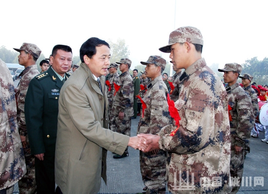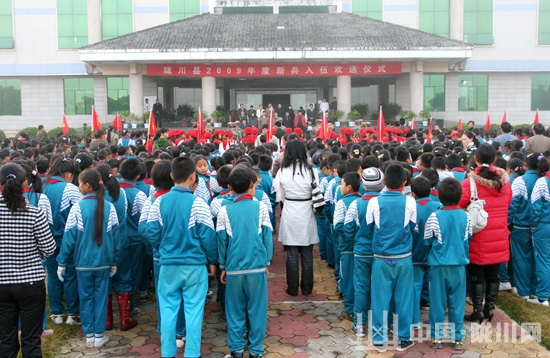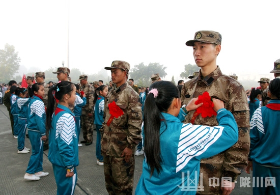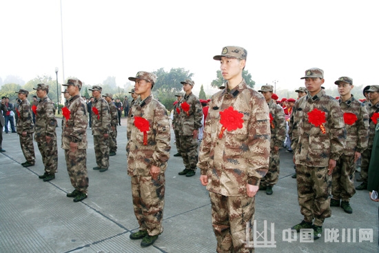 最后,少先队员纷纷给新兵戴上大红花,全体领导与新兵握手祝贺,在大家的祝贺声与锣鼓声中,36名新兵光荣地踏上了新征程。