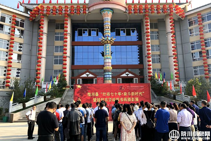 为庆祝中华人民共和国成立70周年,深入贯彻落实党的十九大关于“坚定文化自信,推动社会主义文化繁荣兴盛”的精神,9月29日上午,陇川县举行“壮丽七十年?奋斗新时代”暨脱贫攻坚成效书画摄影展启动仪式。此次展出,是对中华民族优秀传统文化的弘扬,是对新中国成立70年来经济社会发展的巨大成就的热情讴歌,是对陇川县脱贫攻坚成效的集中展示,是对陇川县各族儿女团结奋斗、攻坚克难的深情描绘。