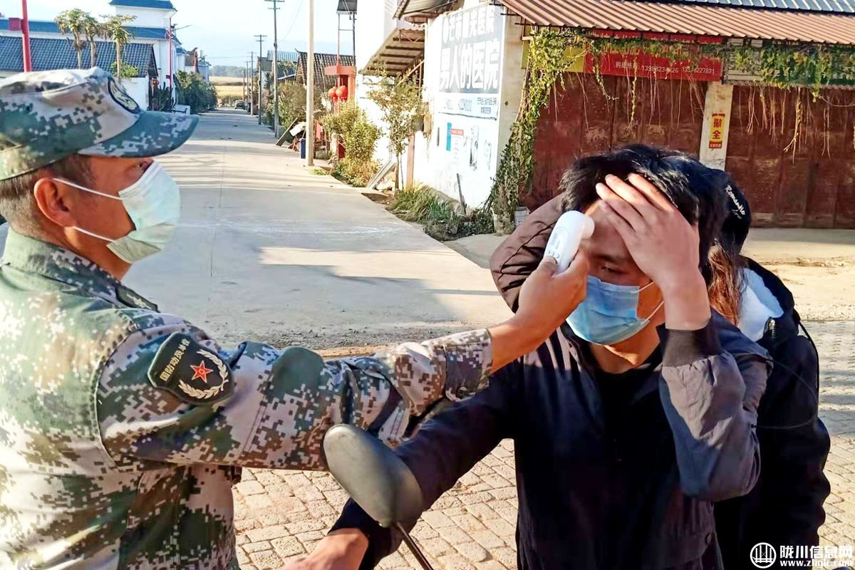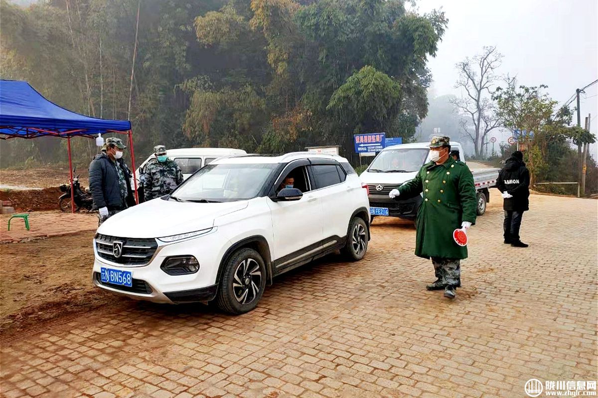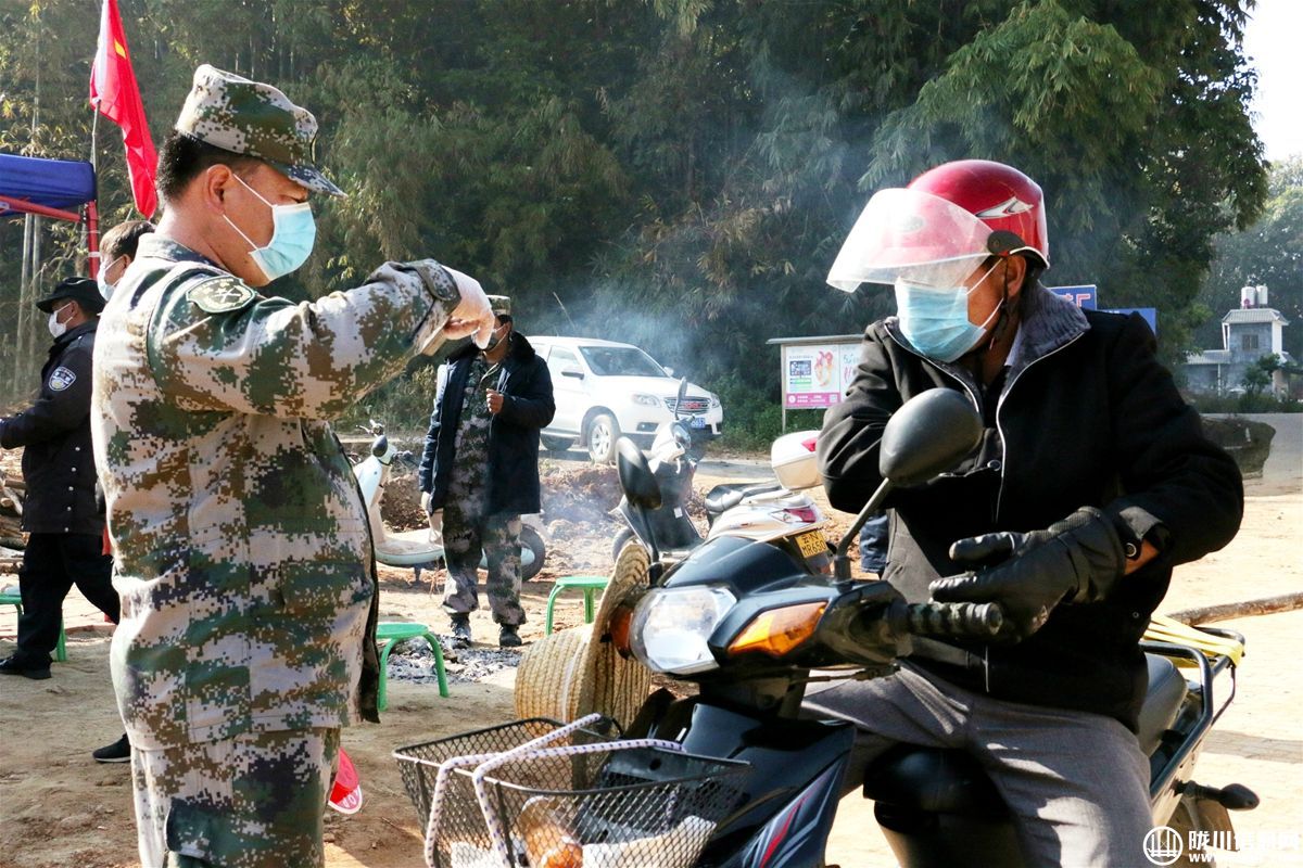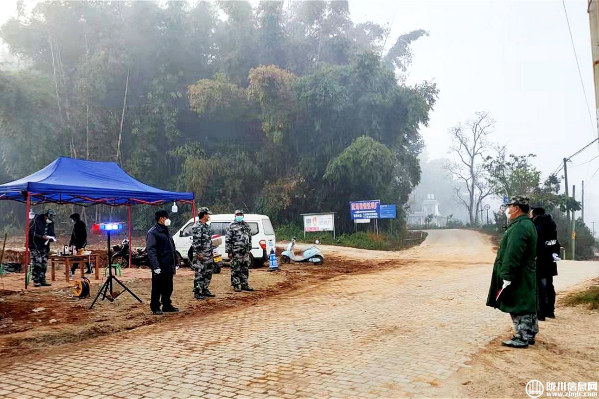 为防止疫情蔓延扩散,加大对流动人员的健康监测和管控力度,阻断输入性病例进入陇川境内,章凤镇党委、政府第一时间成立了章凤镇第一个新型冠状病毒感染的肺炎疫情监测点,该监测点位于章凤镇芒弄村委会南多、南兰、闷帕的交汇处,是瑞丽到陇川的一条重要村级通道。监测点执勤的人员共有2名辅警,10名民兵,他们不分昼伏分两班换勤,全天不间断的进行巡查。在10米开外就能看见警示牌和闪烁灯,“您好,请出示您的证件,您从哪里来,要到何地”……凡是过往车辆和人员他们都进行巡查、登记、体温检测。