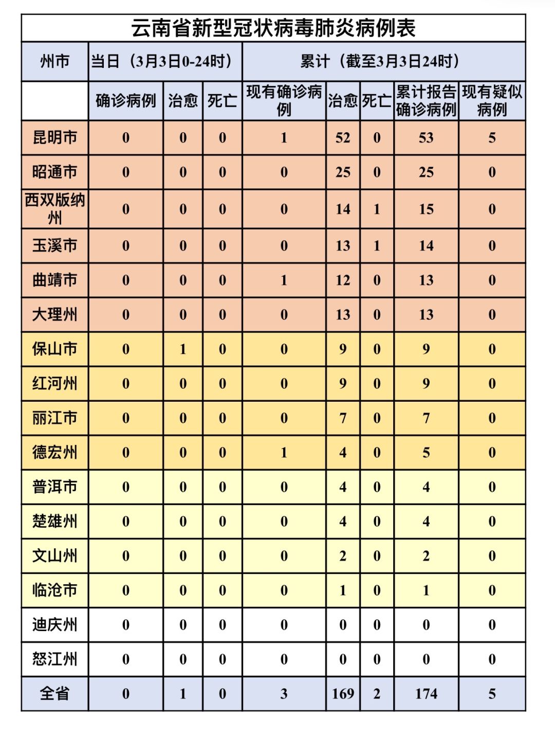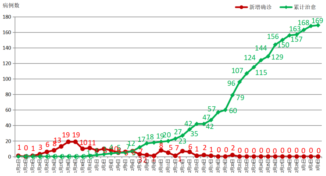 3月3日12时至24时,无新增确诊病例。截至3月3日24时,已连续12天新增病例为0,全省累计确诊病例174例,治愈出院169例,死亡2例,现有确诊病例3例,无重症、危重症病例。现有疑似病例5例。密切接触者当日解除医学观察12 人,正在观察81 人。