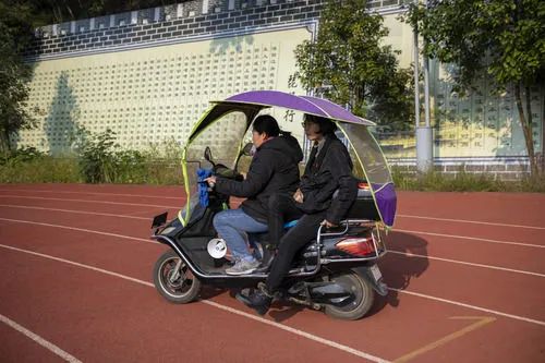 因为腿脚不便,张桂梅(后)坐车从田径场回教学楼(11月30日摄)。