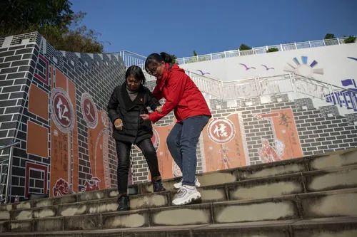 一名老师搀扶张桂梅(左)下台阶(11月30日摄)。