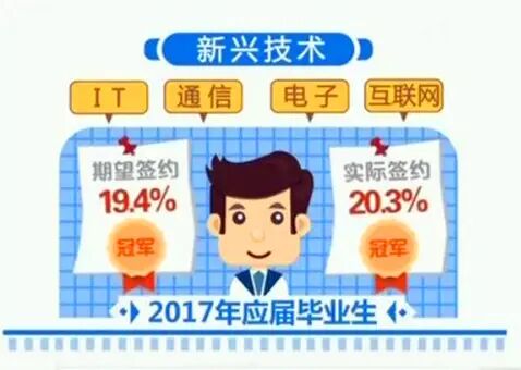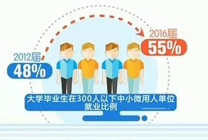 智联招聘发布的《2017年大学生求职指南》报告显示:代表着新兴技术的IT、通信、电子、互联网行业成为2017年应届毕业生期望签约与实际签约领域的双料冠军。而在麦可思研究院发布的《2017年就业蓝皮书》中,大学毕业生在民营企业就业的比例从2012届的53%上升为2016届的60%,在300人以下的中小微用人单位就业的比例从2012届的48%上升为2016届的55%,民企、中小微企业成为了大学生主要就业去向,且比例持续上升。