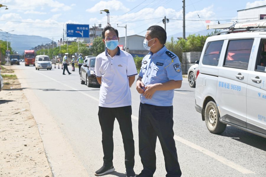 检查组一行先行来到章凤至城子路出城口交警交通检查点,郑洪云听取了交警大队长杨万荣交通安全管理工作介绍,通过现场提问等方式,深入了解公安机关在COP15会议期间针对人流、物流、道路交通安全保障工作采取的具体措施。