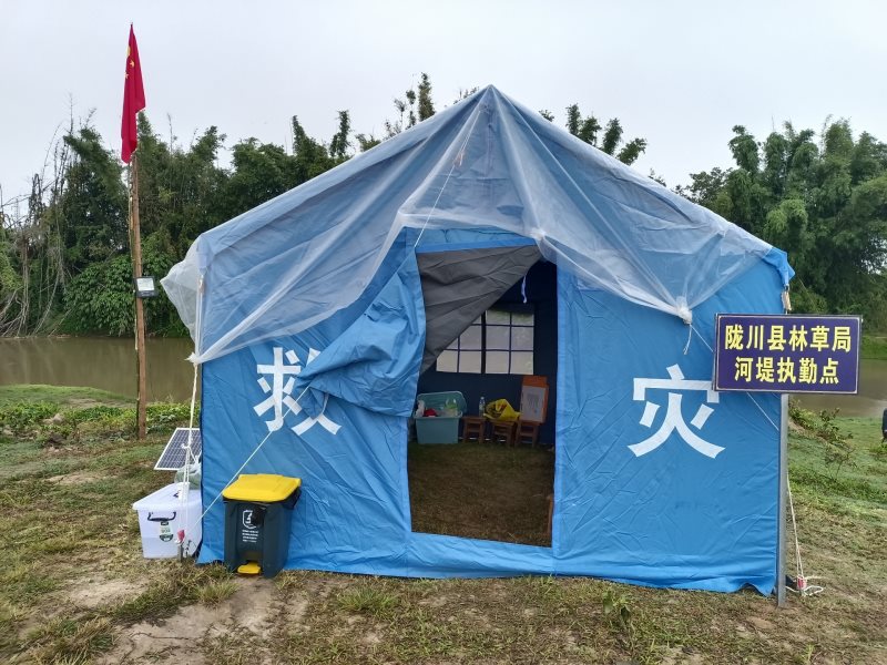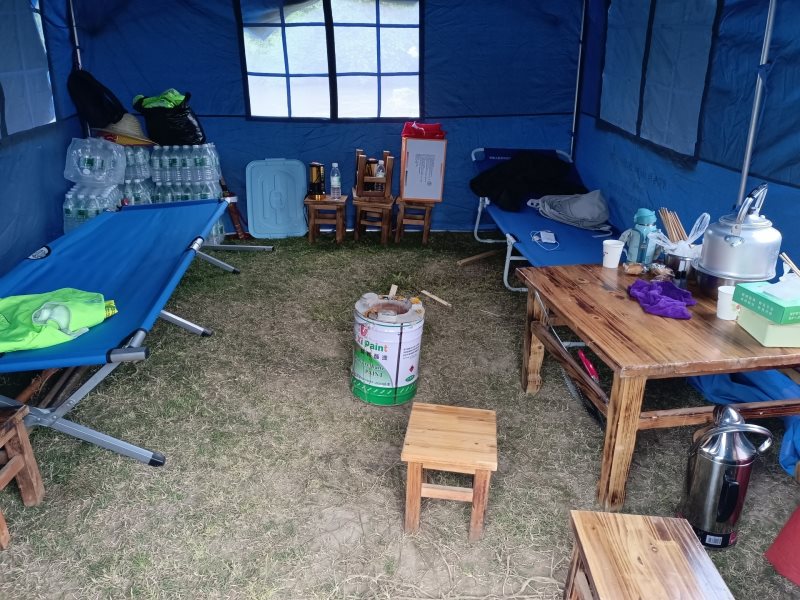 一面党旗、一面国旗、简易的帐篷、两张折叠床,一套桌椅、几件矿泉水、几盘蚊香组成了值守“小家”,桌子上摆放着《工作日志》《交接班登记表》等物品,虽简陋也温馨。