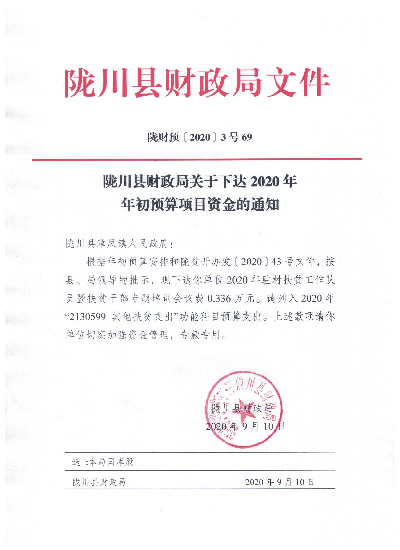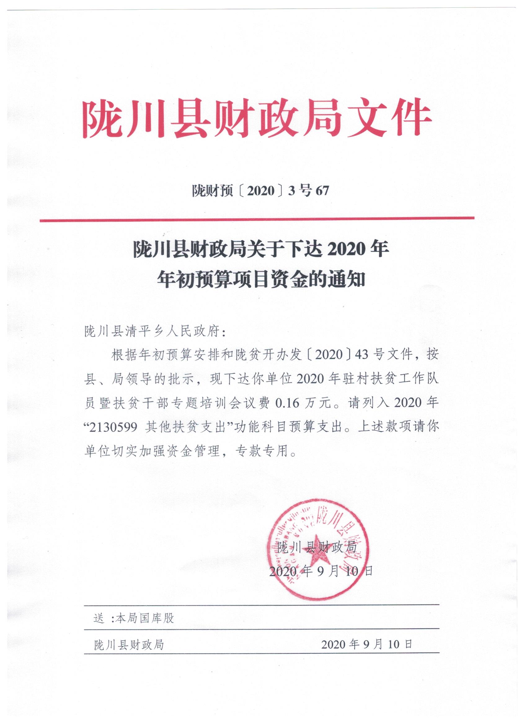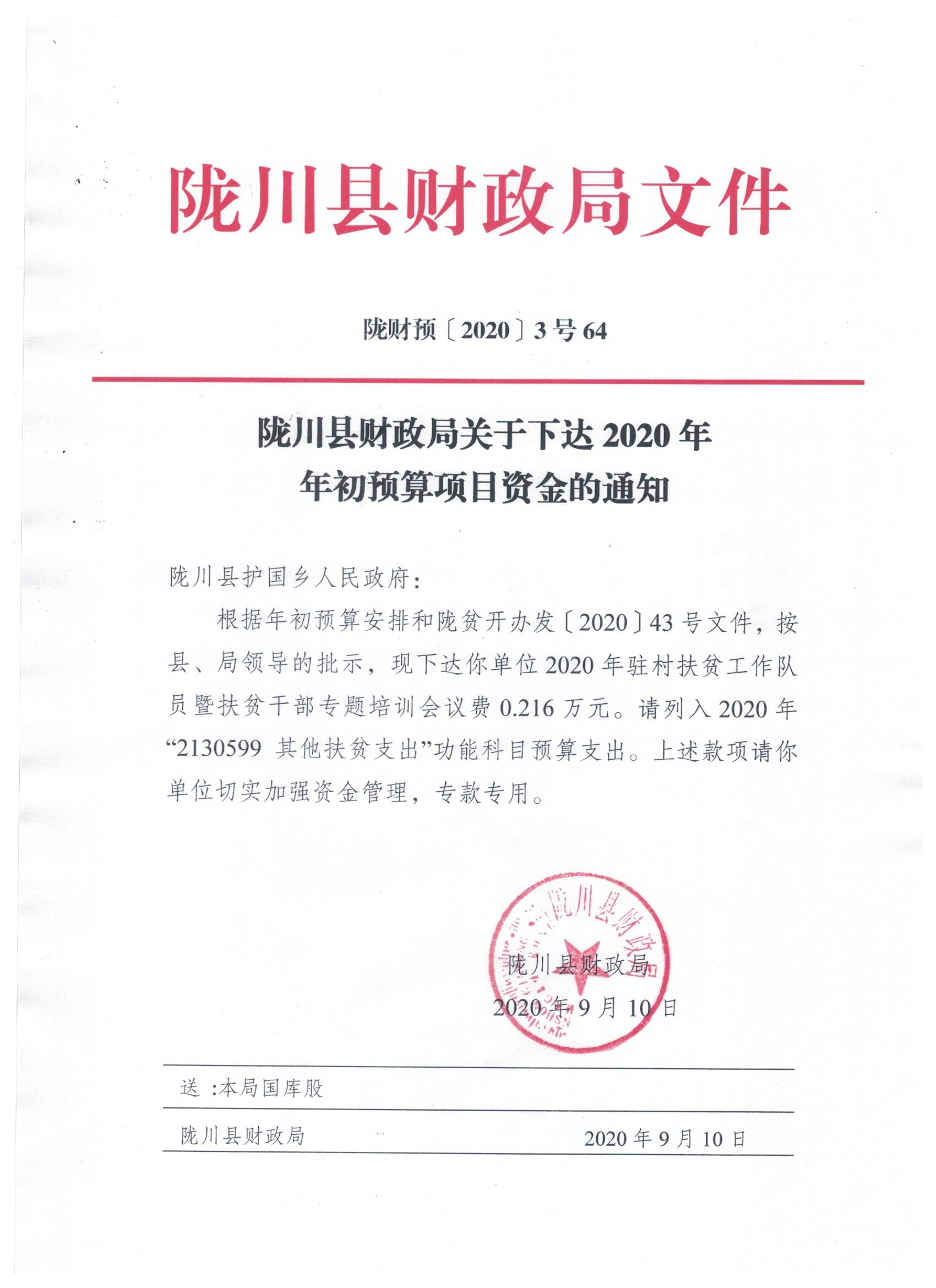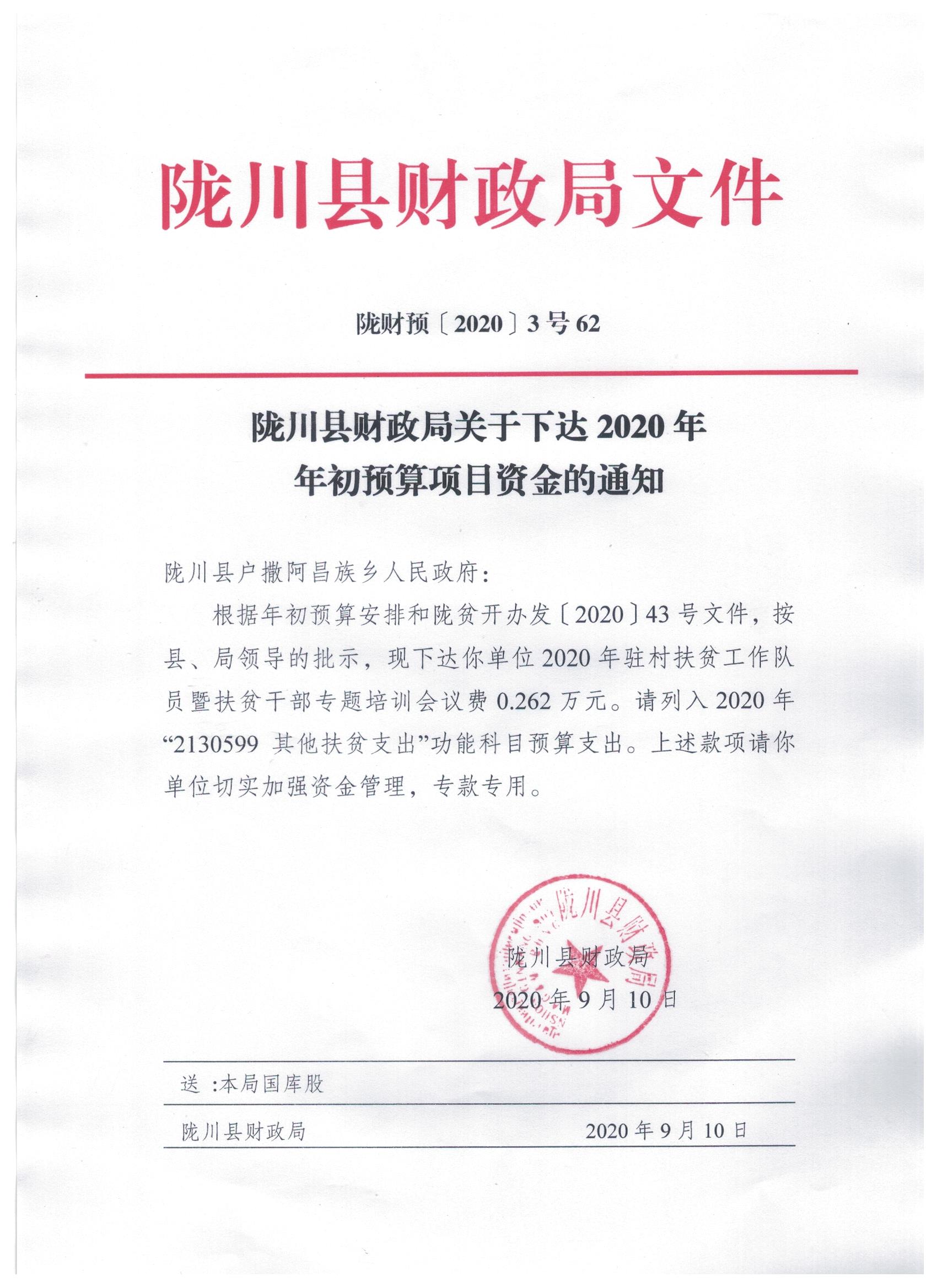 文件名9:陇川县财政局关于下达2020年年初预算项目资金的通知