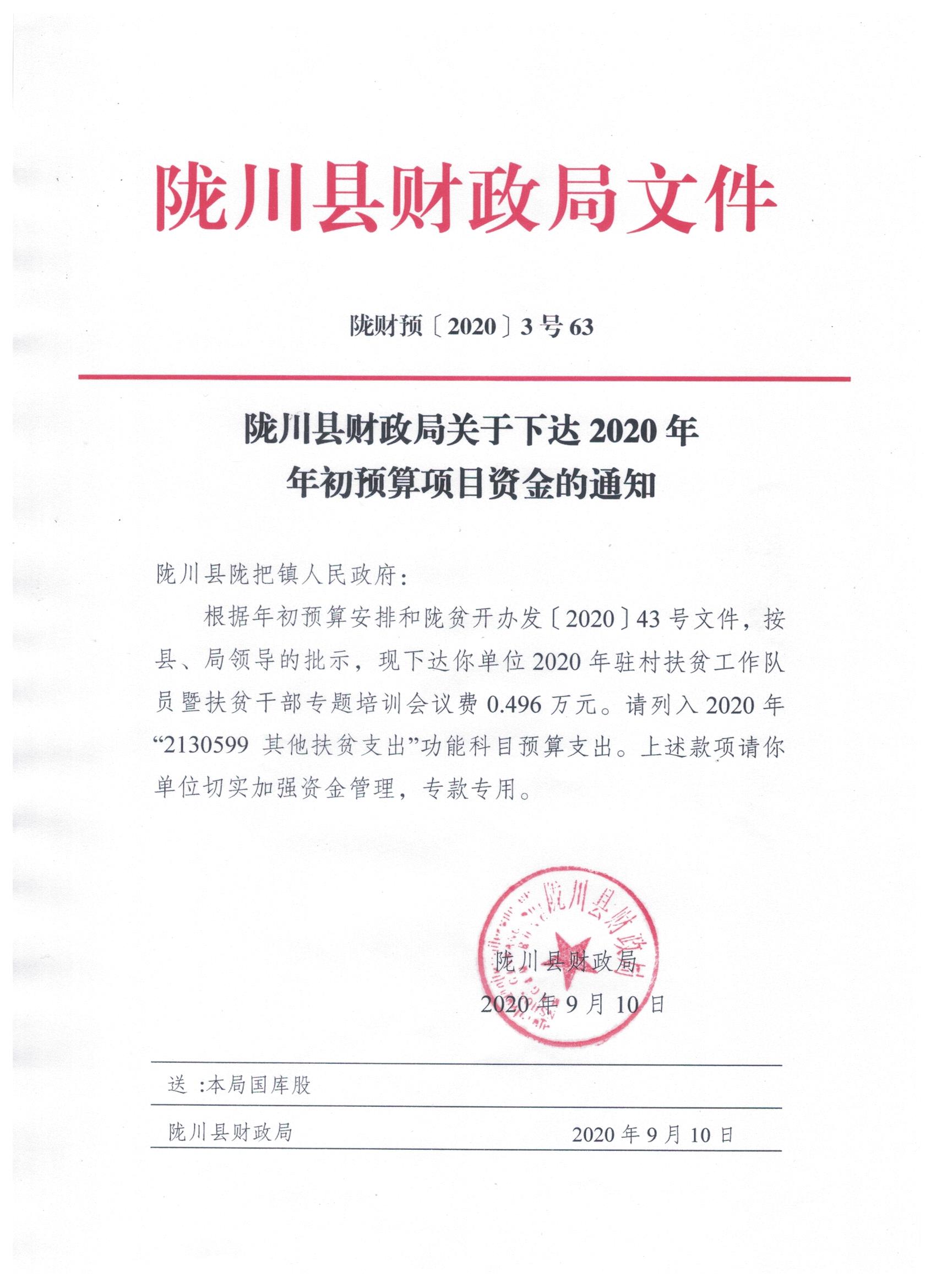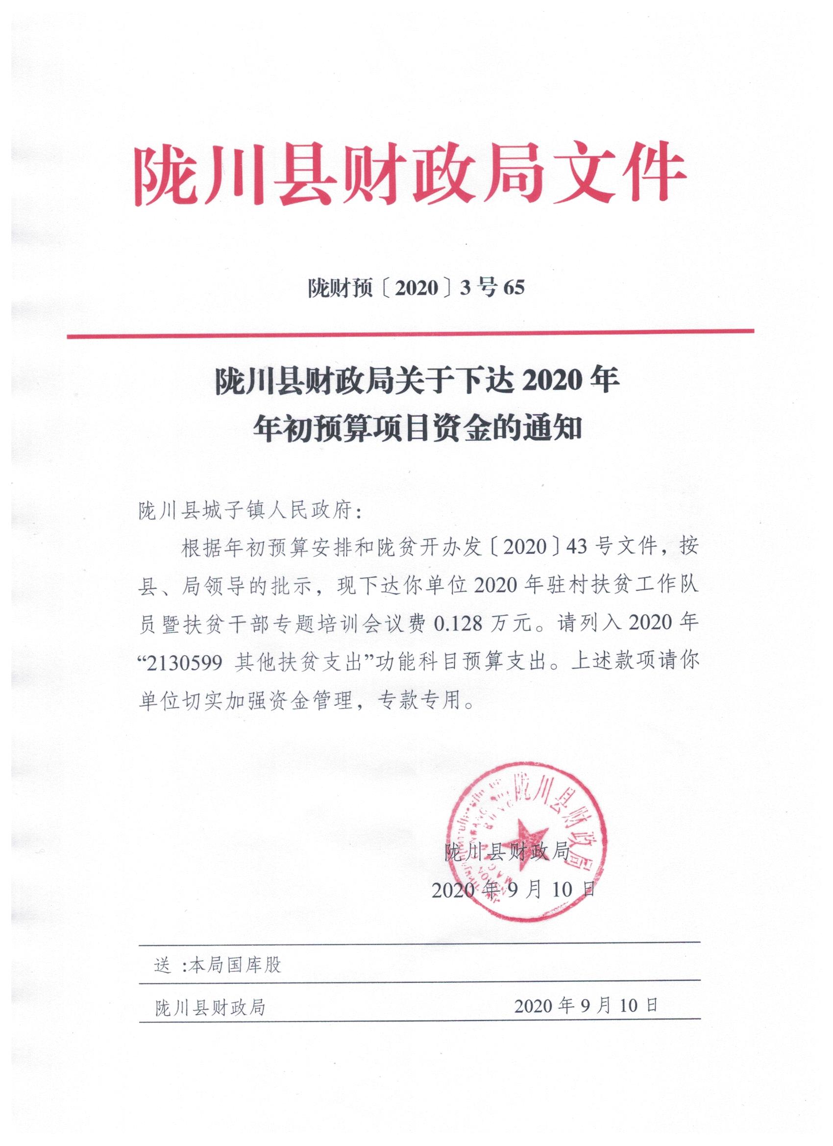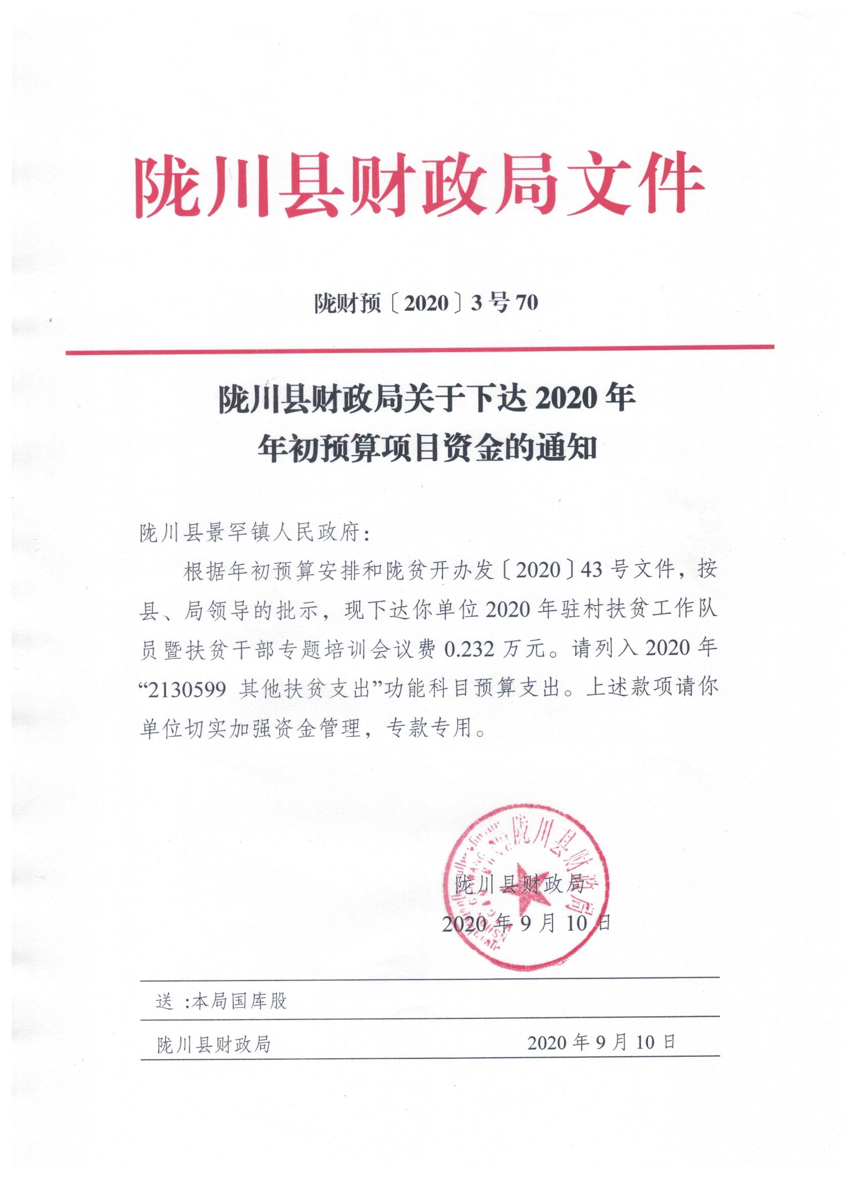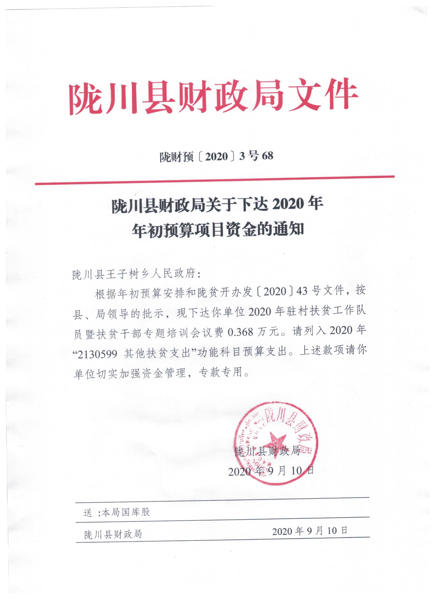 文件名9:陇川县财政局关于下达2020年年初预算项目资金的通知