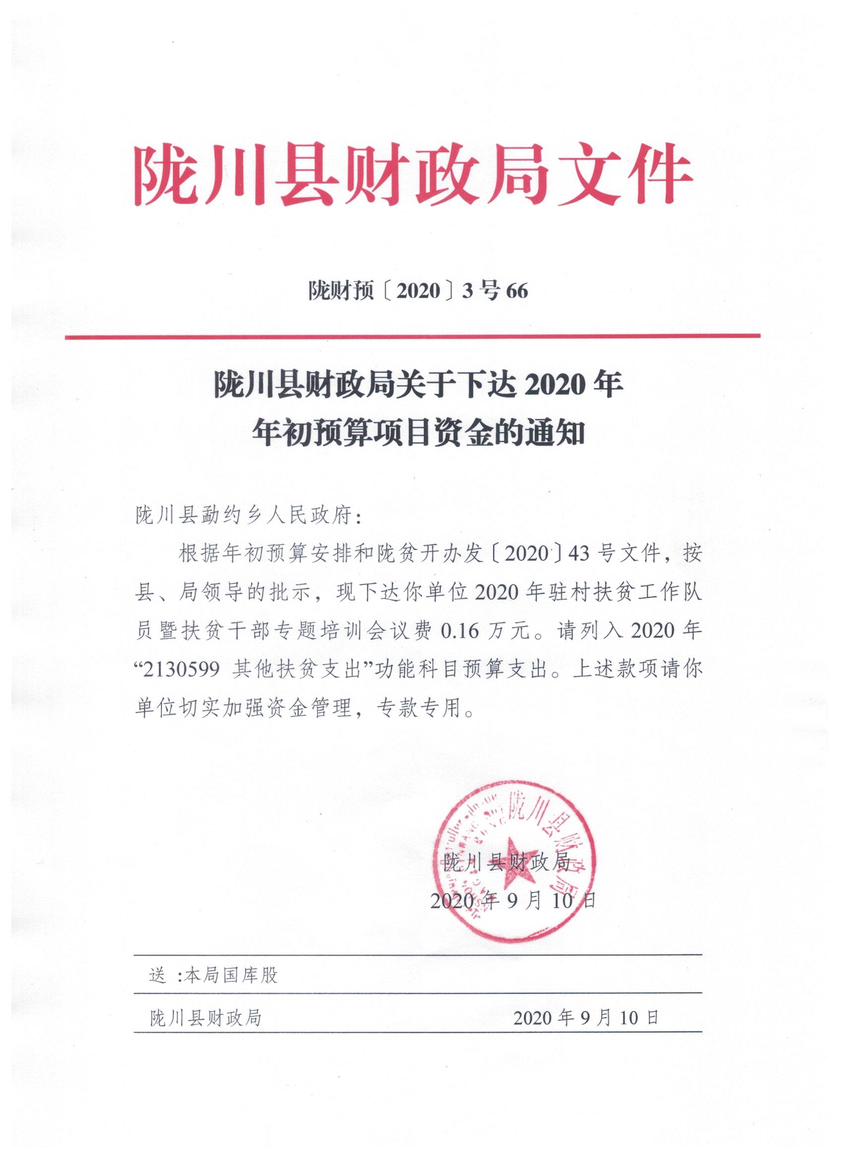 文件名16: 陇川县财政局关于下达2020年年初预算项目资金的通知