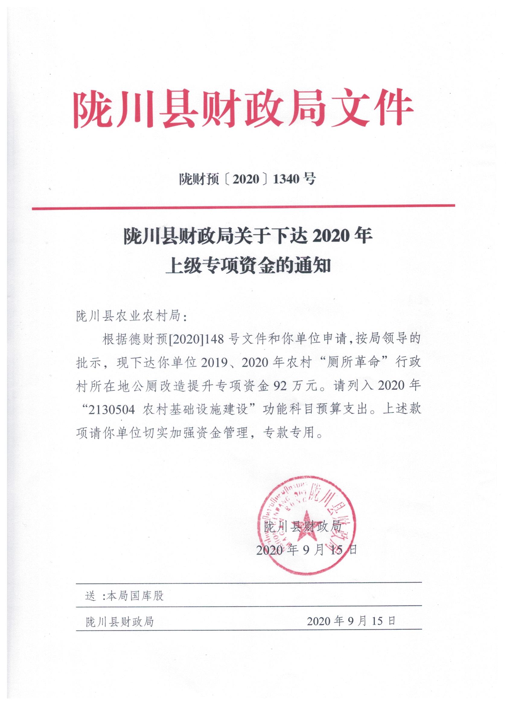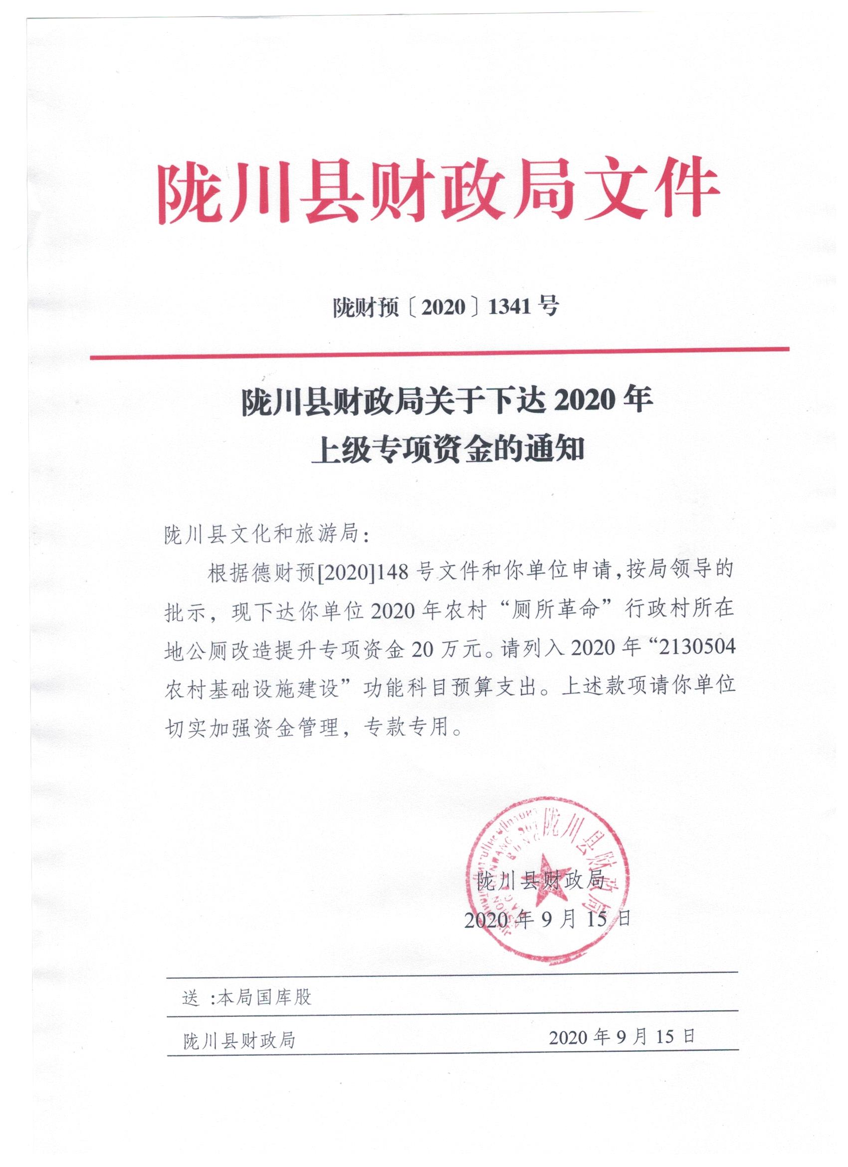 文件名5:陇川县财政局关于下达2020年上级专项资金的通知