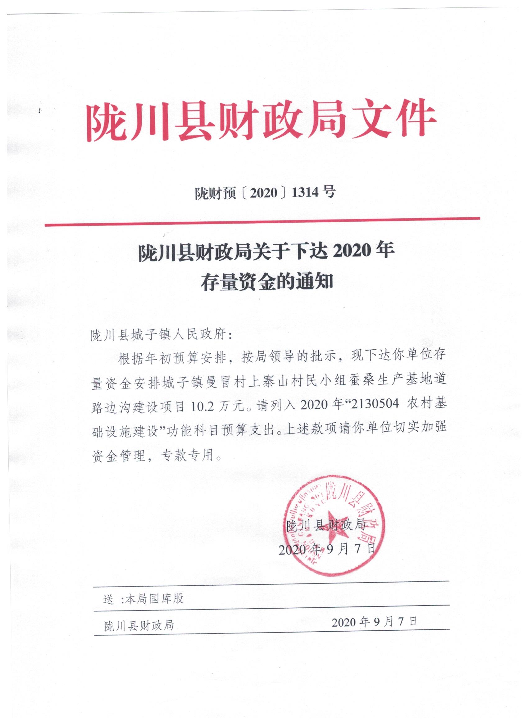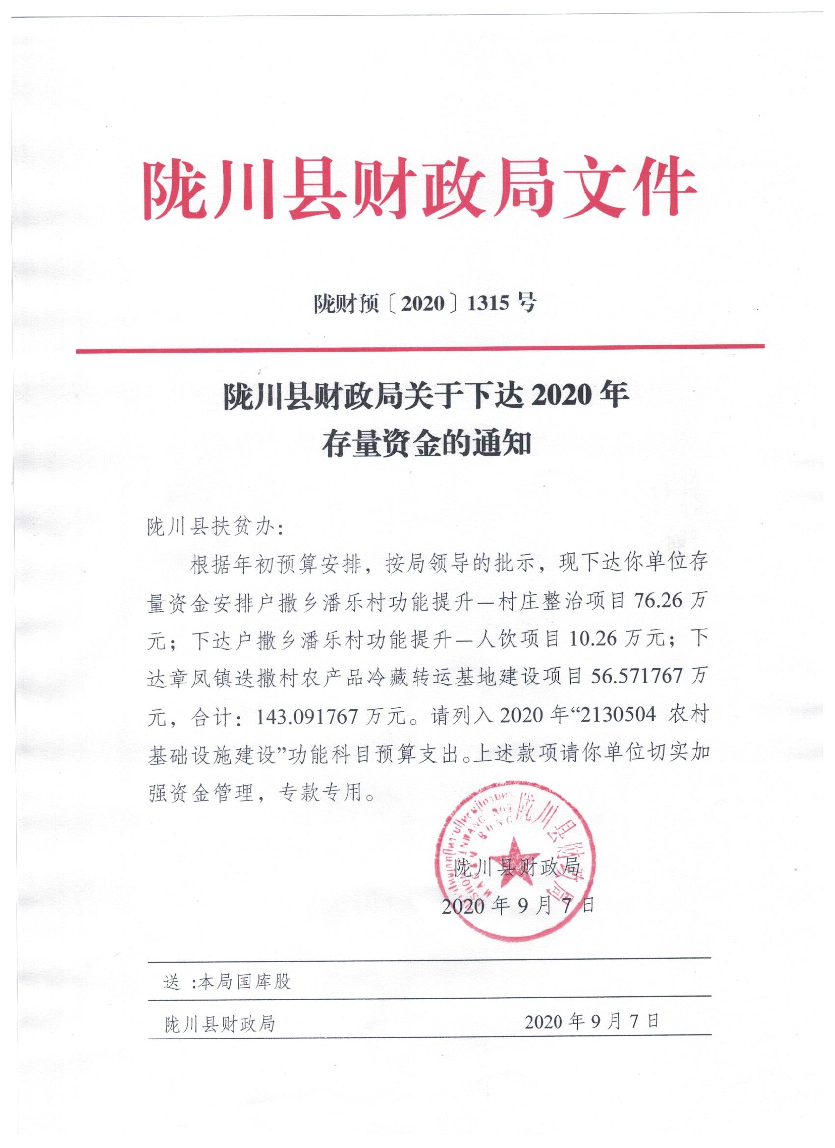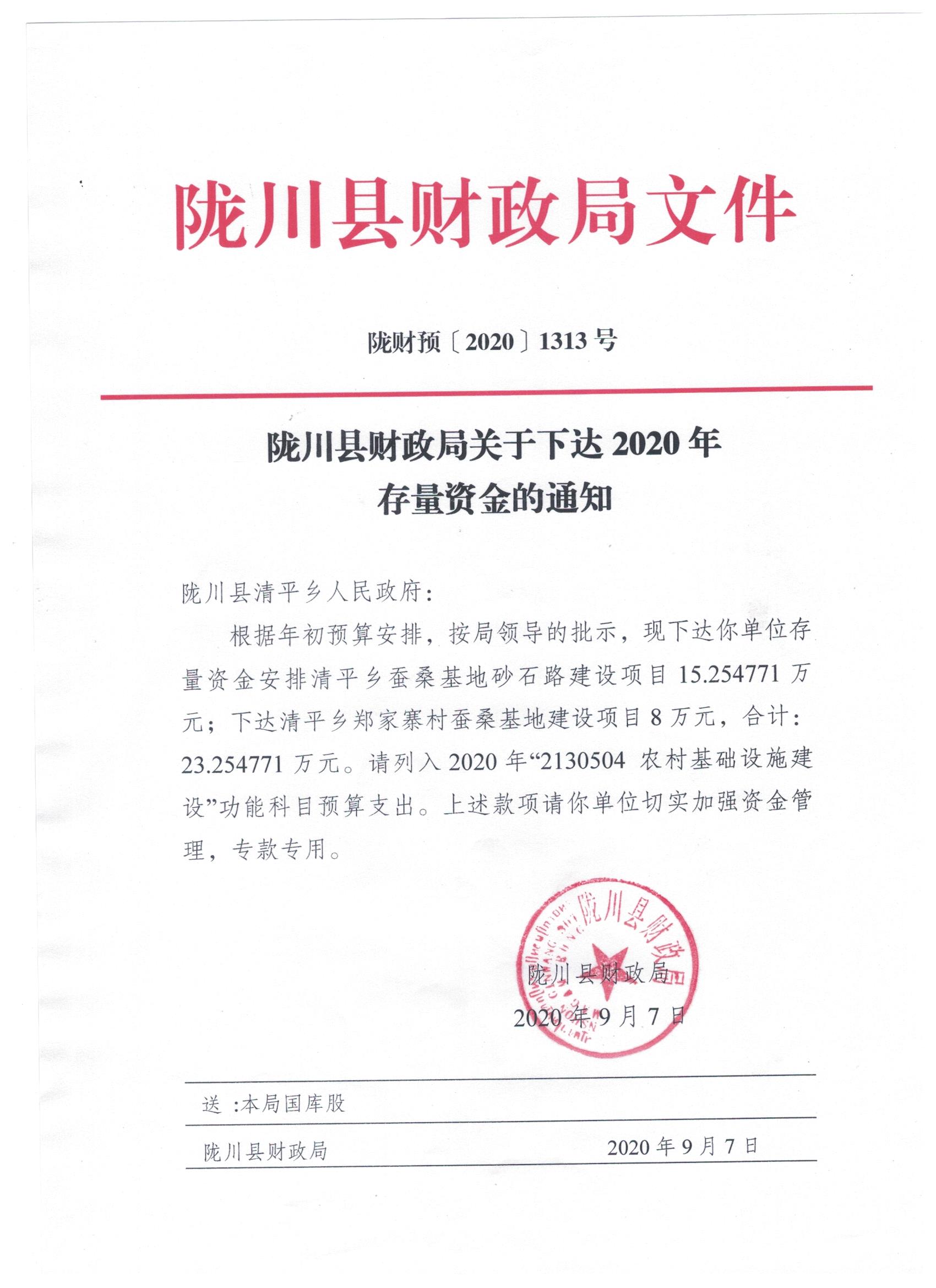 文件名1:陇川县财政局关于下达2020年存量资金的通知