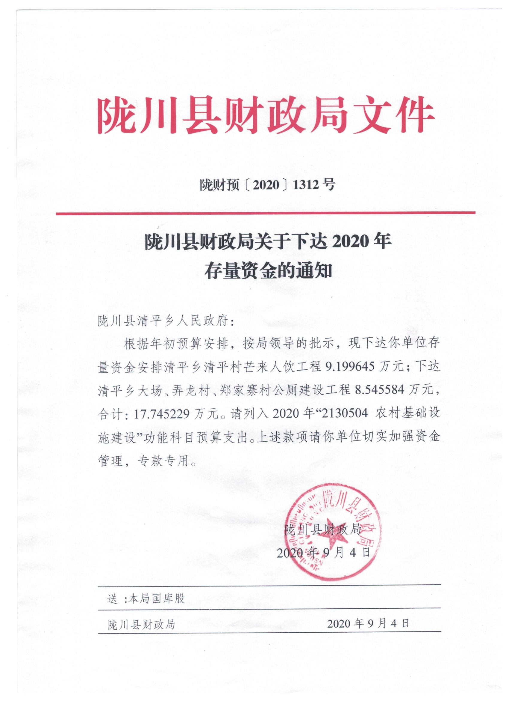 文件名4:陇川县财政局关于下达2020年存量资金的通知