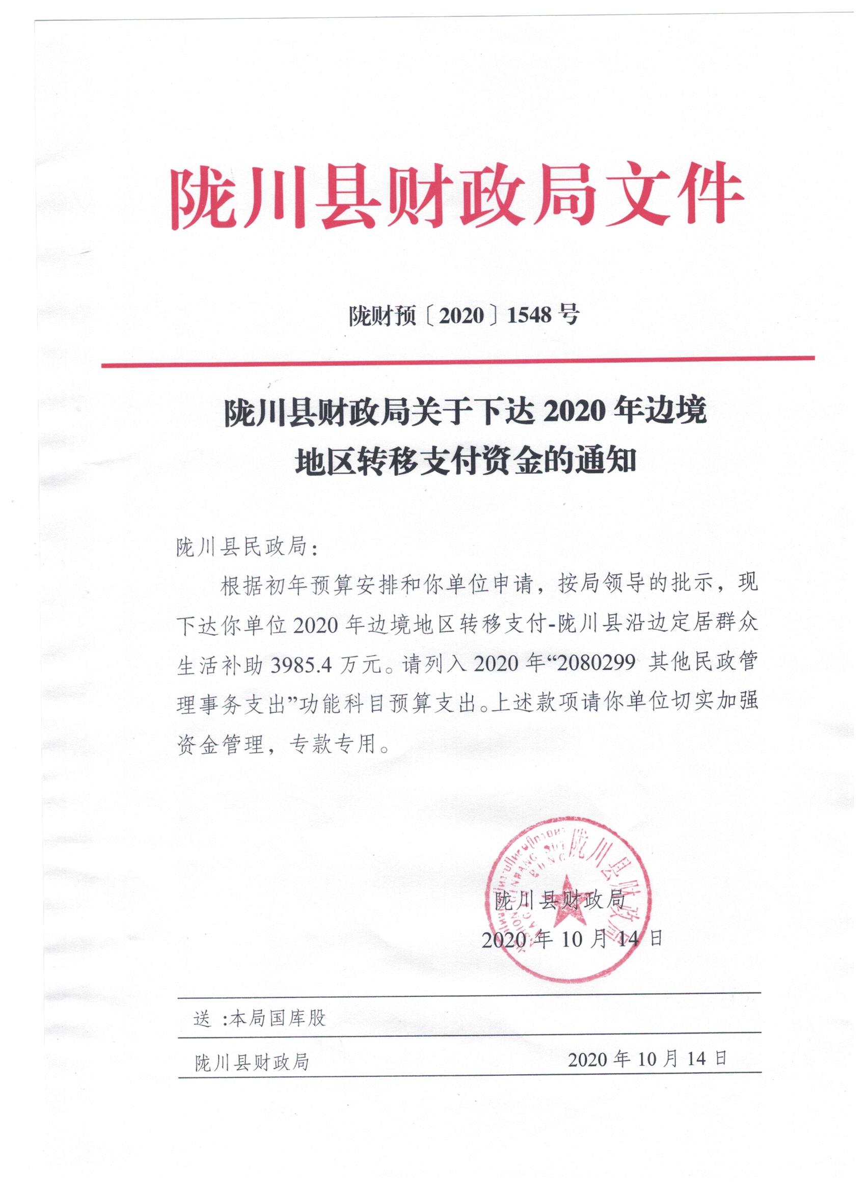 文件名2:陇川县财政局关于下达2020年边境地区转移支付资金的通知