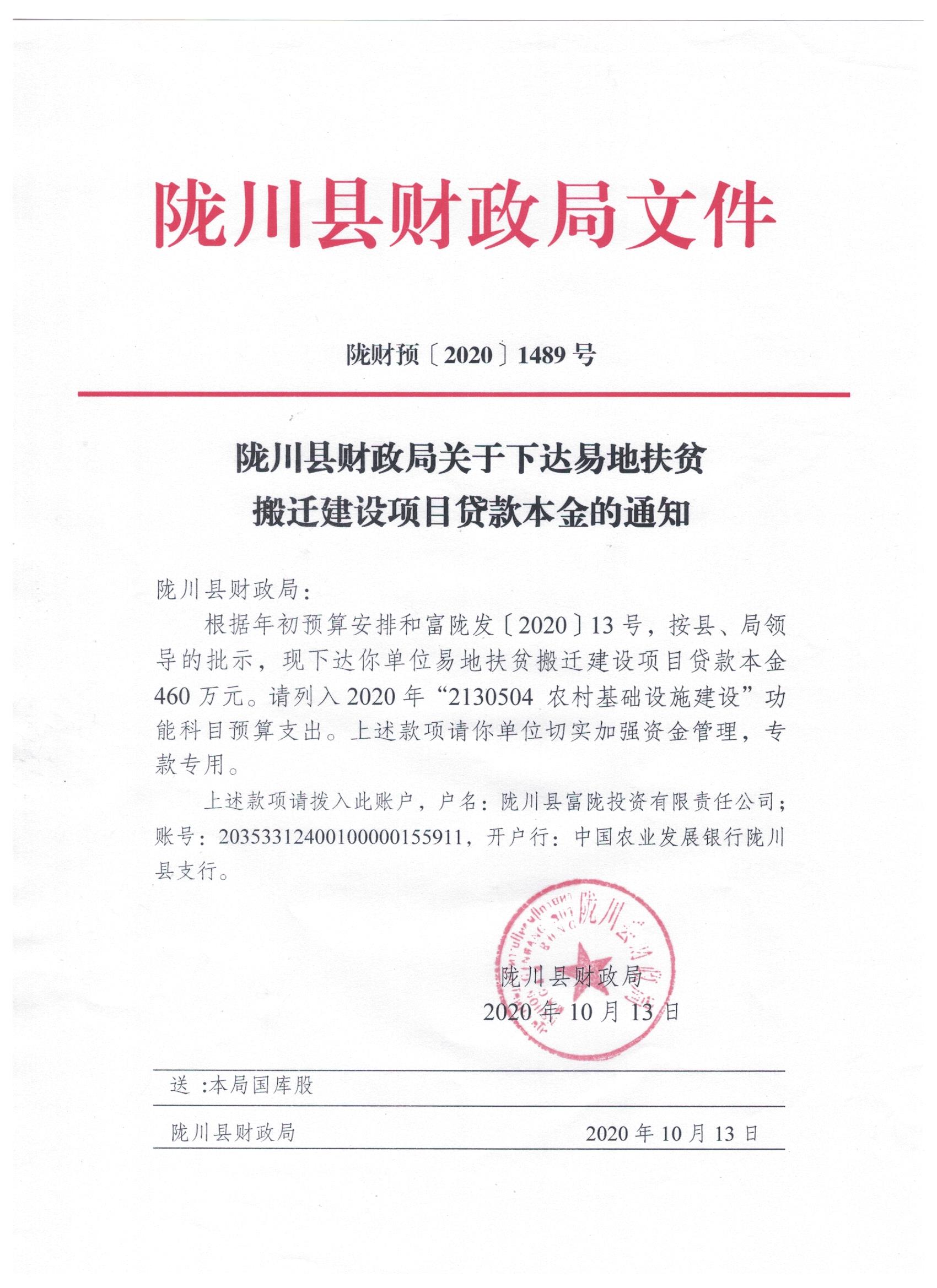 文件名1: 陇川县财政局关于下达易地扶贫搬迁建设项目贷款本金的通知