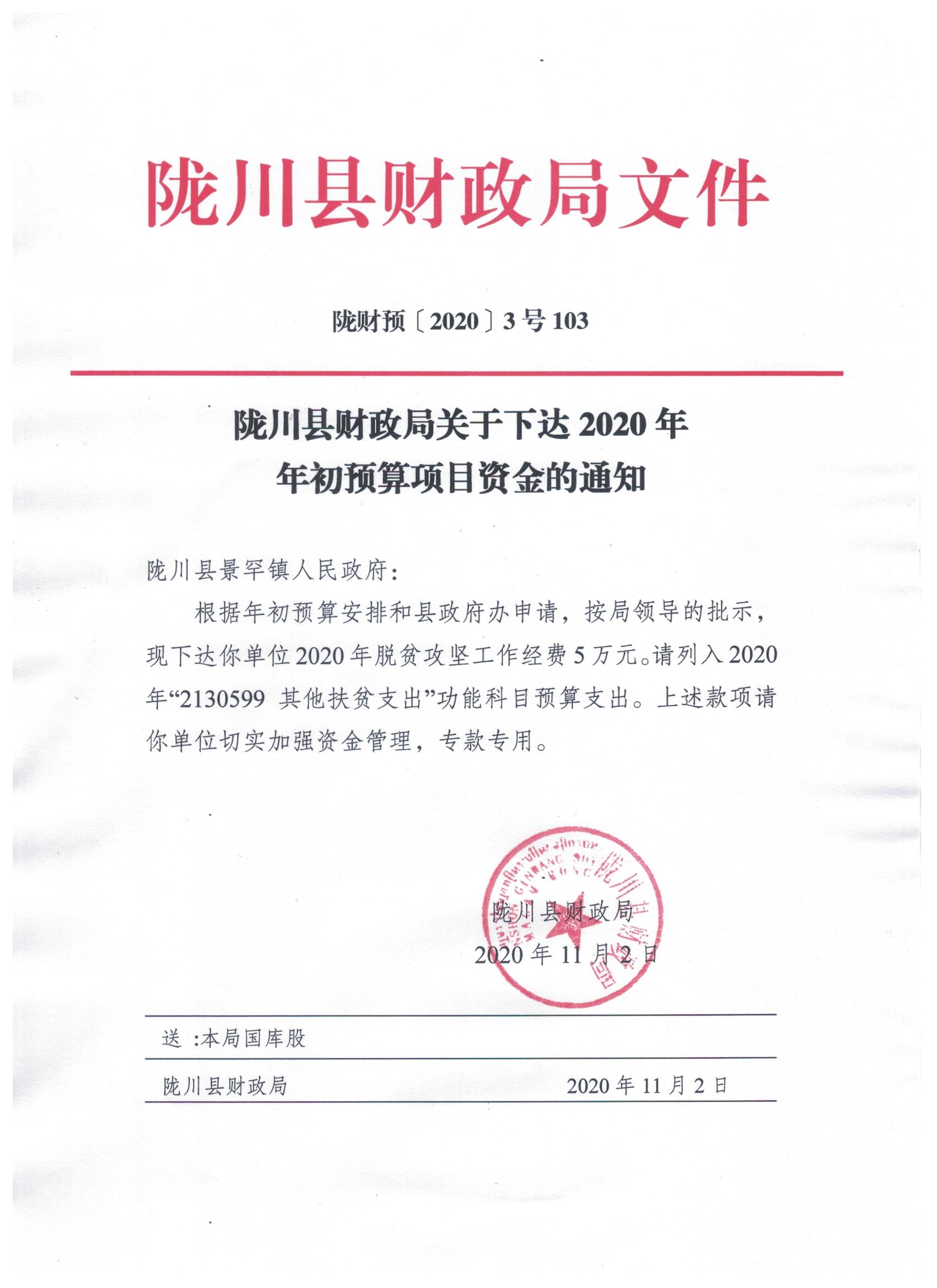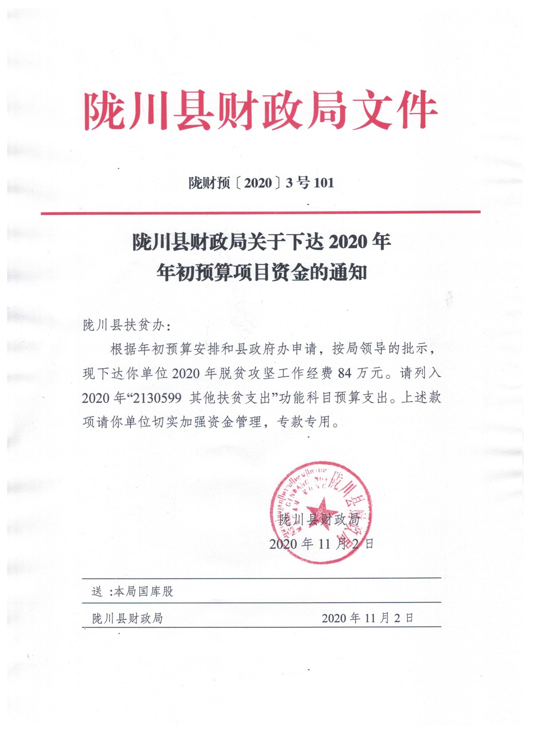 文件名1:陇川县财政局关于下达2020年年初预算项目资金的通知