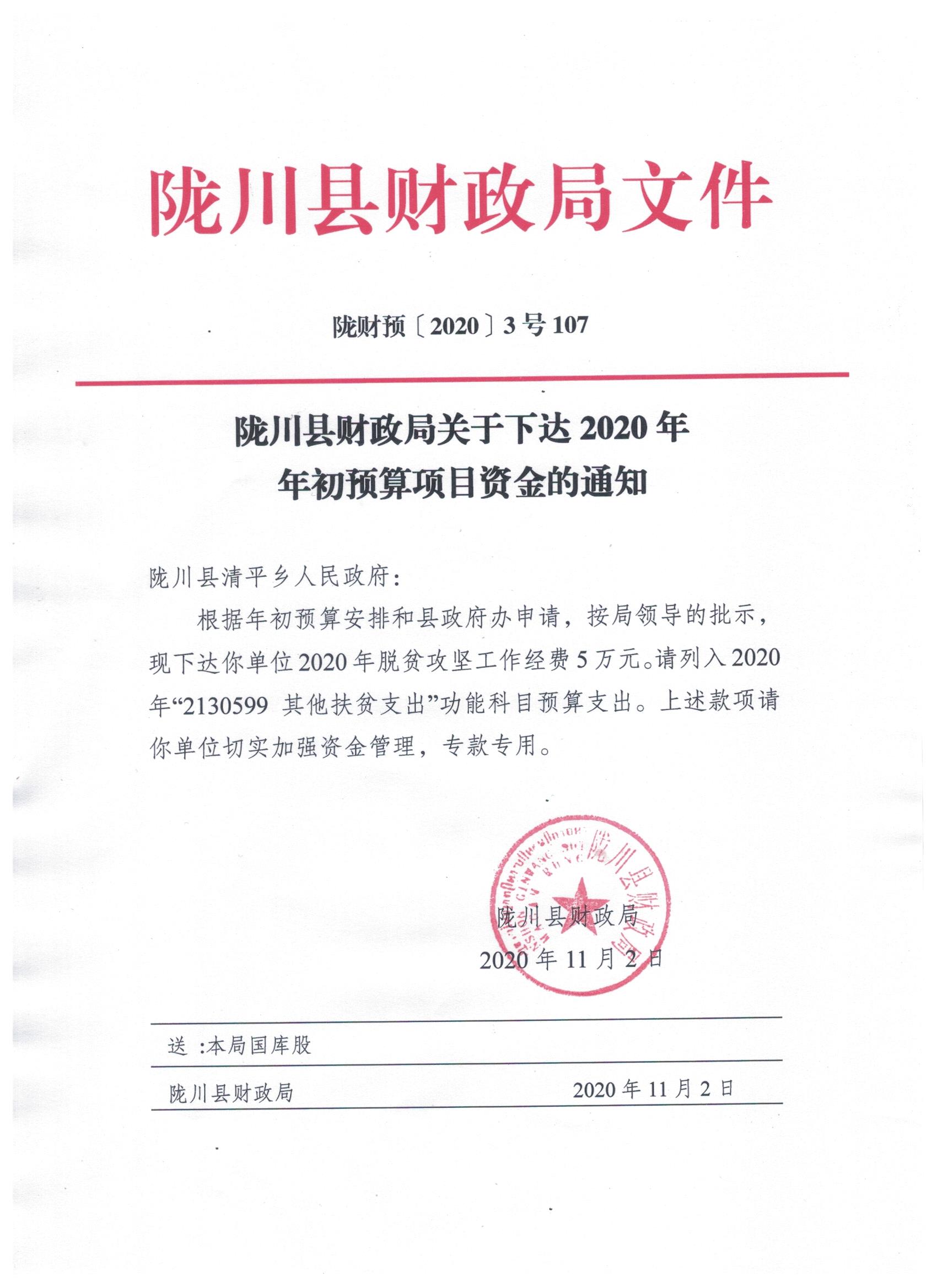 文件名7:陇川县财政局关于下达2020年年初预算项目资金的通知