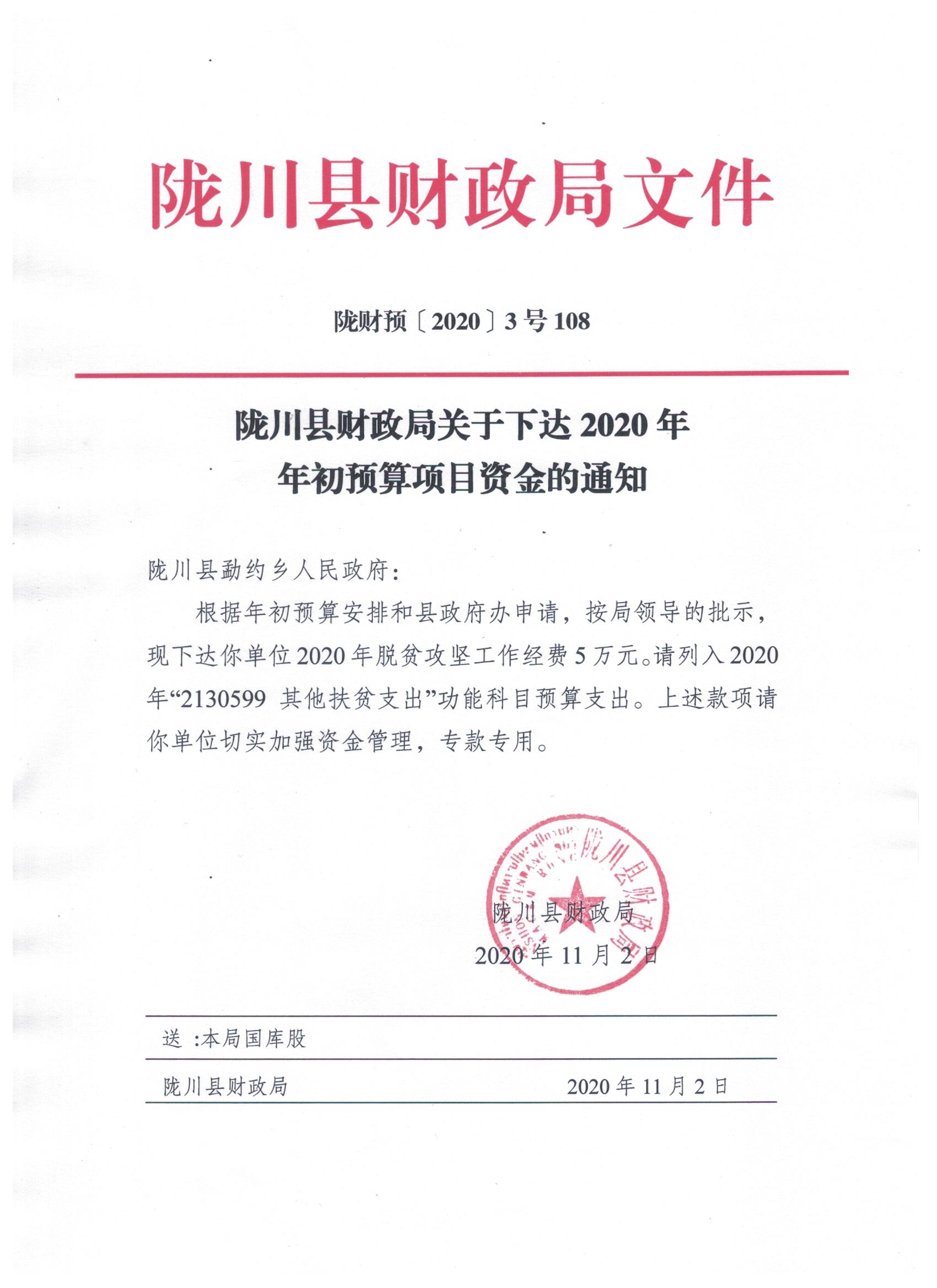 文件名8:陇川县财政局关于下达2020年年初预算项目资金的通知