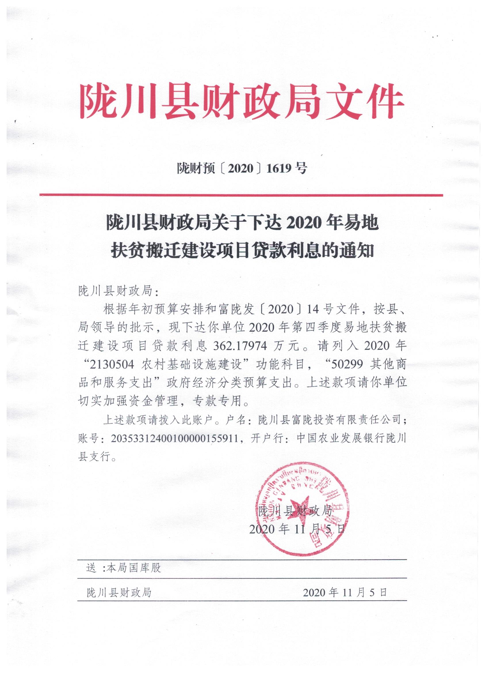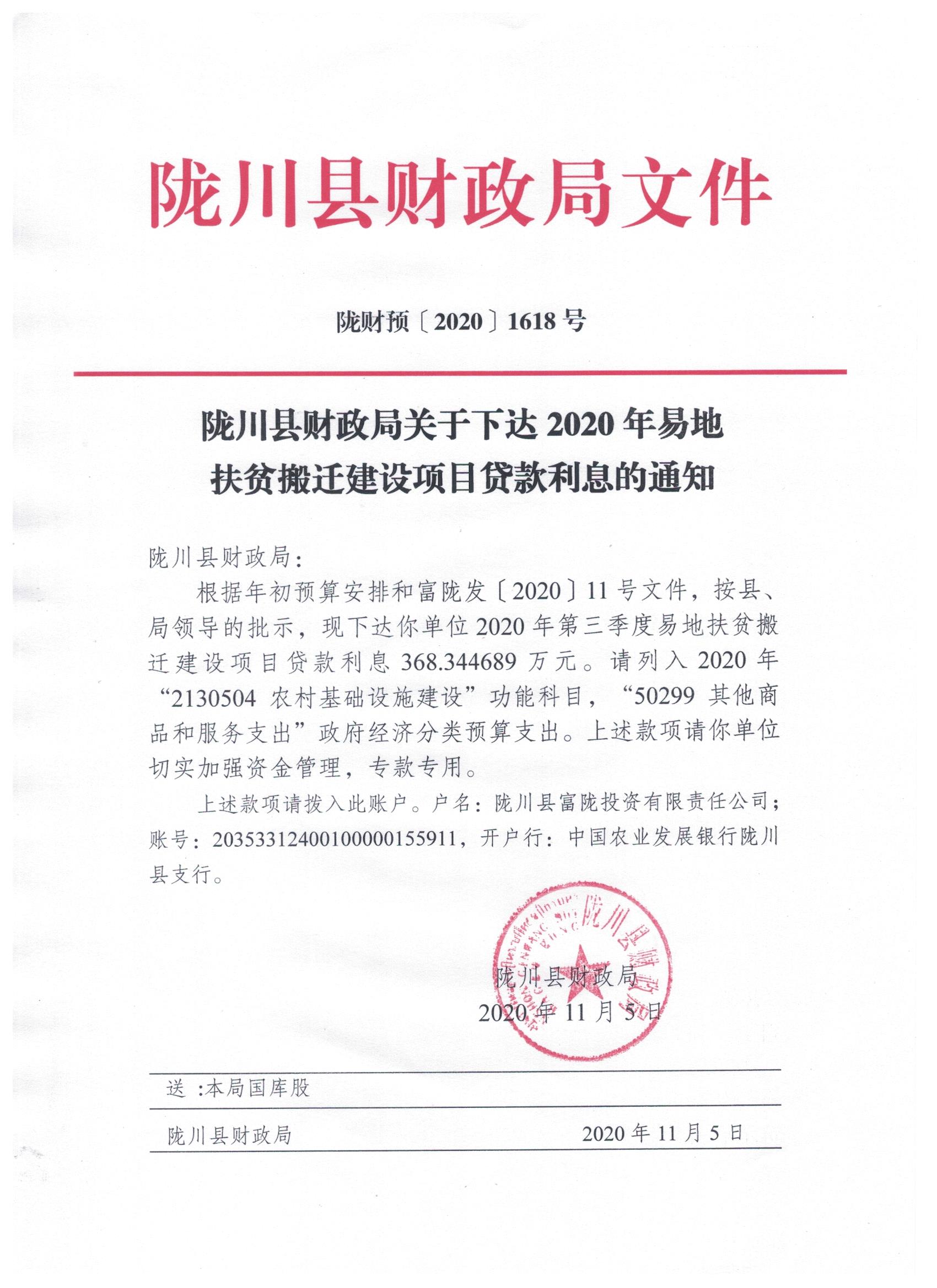 文件名13:陇川县财政局关于下达2020年易地扶贫搬迁建设项目贷款利息的通知