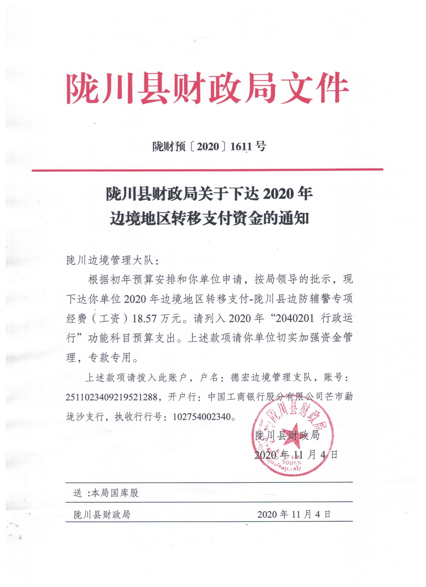 文件名11:陇川县财政局关于下达2020年边境地区转移支付资金的通知