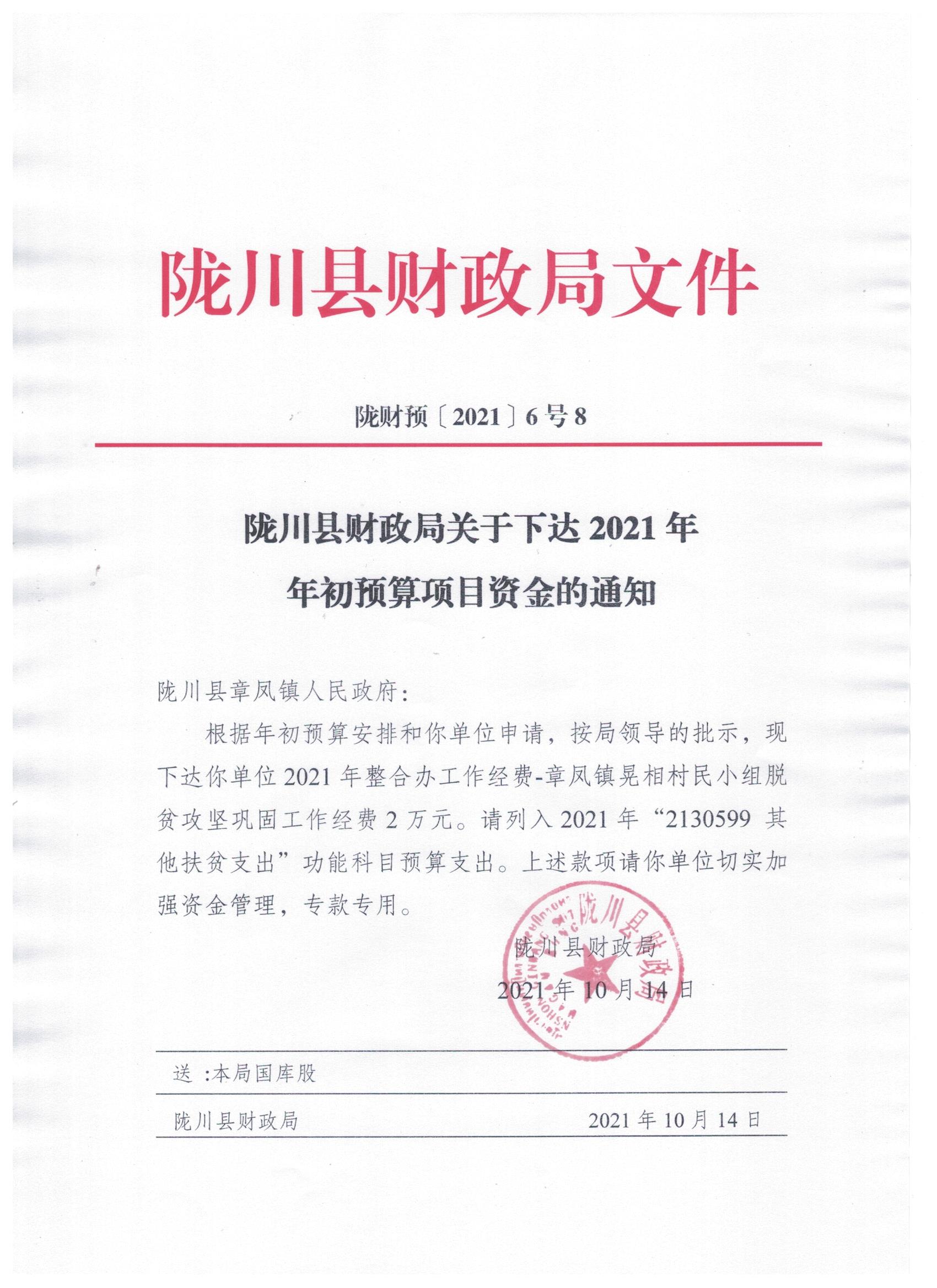 文件下达的资金名称:2021年整合办工作经费-章凤镇晃相村民小组脱贫攻坚巩固工作经费