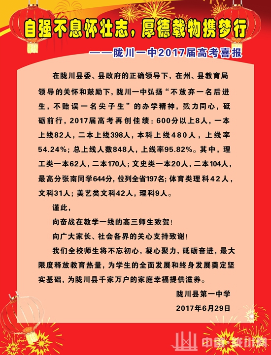 根据德宏州教育局对县市教育局2017年度工作目标管理主要指标要求,陇川县第一中学计划招生1000人。根据《云南省教育厅转发教育部办公厅关于做好2017年义务教育招生入学工作的通知》(云教函〔2017〕78号)和《德宏州教育局关于认真做好2017年初中学业水平考试和高中阶段学校招生录取工作的通知》(德教发〔2017〕24号)的要求:从2017年起公办普通高中学校不再招收择校生;在下达公办普通高中招生计划时,必须拿出总计划的50%分配到区域内初级中学。我县按计划招生1000人计算,50%的定向生为500人,依据各校报考人数的比例定向分配到每一所初级中学录取。在1000人的招生指标中招收特长生80人,其中体育40人,音乐20人,美术20人;继续在择优招生指标中招收收一个民族班,人数为50人。招生明细分解如下: