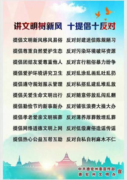 “讲文明树新风 十提倡十反对”是把中国特色社会主义和中国梦德宏篇章宣传教育、培育和践行社会主义核心价值观贯穿全过程,重点做好移风易俗、保护生态、尊重他人、爱护环境、治理违建、文明出行、勤俭节约、孝老爱亲、网络道德、雷锋精神十个选题,让公益广告大众化、通俗化,把核心价值观融入百姓日常生活中,从而旗帜鲜明地传播主流价值观念,树立文明德宏道德新风尚。