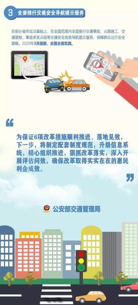 六、全面推行交通安全导航提示服务。在部分省市试点基础上,在全国范围内全面推行交通安全导航提示服务,对交通事故、占掘路施工、交通管制、公路事故多发点段等情况,通过地图导航向交通参与者发布交通安全预警提示信息,保障群众出行安全顺畅。2020年3月底前,全国全面实施。