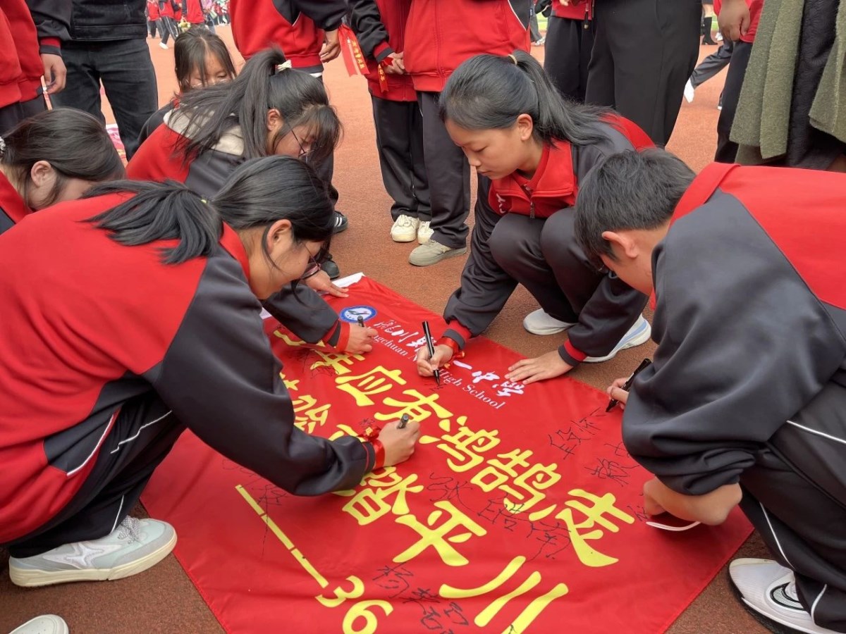 接下来的授旗仪式由主席台的领导将代表信任与责任的旗帜传递到班主任手中,班主任们又把这面沉甸甸的旗帜传递到班长手中,班长代表本班同学扛着旗帜沿会场奔跑一圈,以展示他们以此旗帜为引领,奋斗最后一百天的信心和决心。