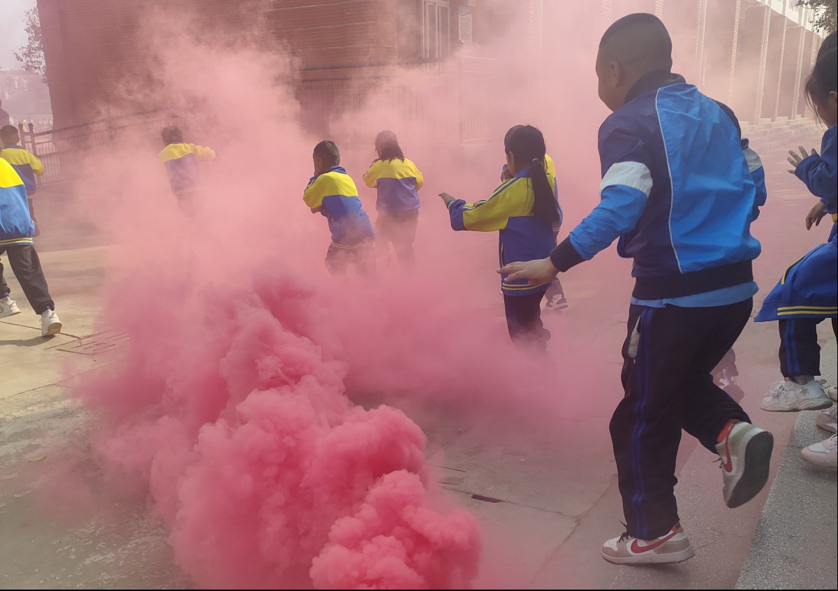 此外,通过召开专项会议,向师生强调演练要点,班主任提前指导学生熟悉疏散路线,为演练成功奠定基础。 演练正式开始,火警哨声响起,灭火组迅速在各楼道投掷烟雾弹,模拟真实火灾场景,刺鼻烟雾瞬间弥漫。全体师生立即响应,在教室老师组织下,学生将凳子放入桌下,按照规定路线有序撤离。下楼时,三楼学生走外排扶栏杆,二楼学生走内排扶墙,中间留出应急通道。大家用湿毛巾捂住口鼻,身体放低前行,避免吸入烟雾。各班级依预定顺序,从教室和宿舍安全疏散至足球场集合点,全程安静迅速,未出现推搡、踩踏情况。集合后,各班班主任认真清点人数并及时上报。