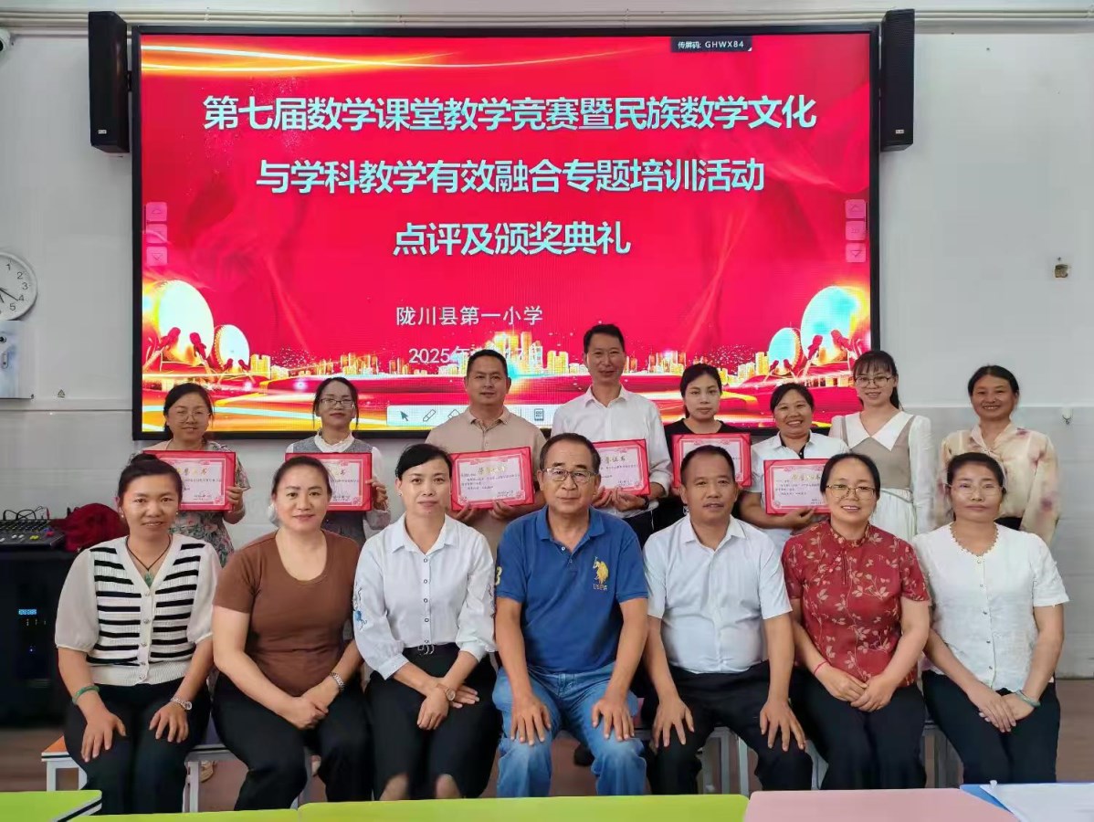 为推进小学数学课堂教学改革,探索“347”课堂教学模式的实效性,搭建教师展示与交流的平台,陇川县第一小学于 2025 年 4 月 17 日成功举办了“第七届数学课堂教学竞赛暨民族数学文化与学科教学有效融合专题培训活动”。此次活动邀请到德宏师范高等专科学校二级教授周长军、陇川县小学数学教研员穆勒滚现场指导,评委由我校数学名师工作室 7 位成员担任,参赛教师是各年级推选的优秀数学教师代表。