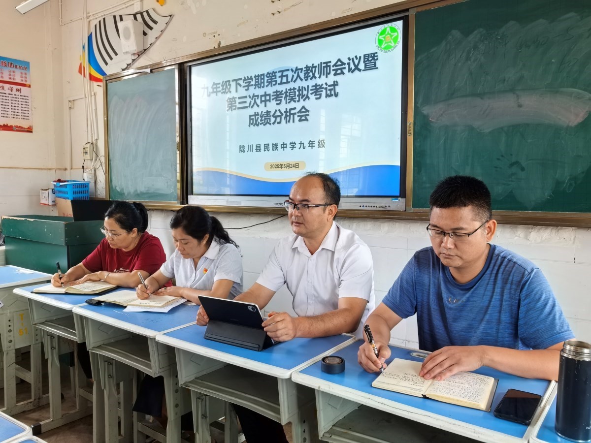 中考冲刺进入最后一个月的关键阶段,为精准分析第三次中考模拟考试成绩,明确冲刺方向,2025年5月24日,陇川县民族中学九年级召开教师会暨模考成绩分析会,全体教师聚焦核心任务,全力备战中考。会议由年级主任屈生娥主持,校党委书记董诗祥、德育副校长杨荣听出席并讲话。