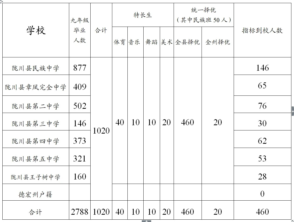 陇川县第一中学计划招生1020人,其中:面向全州择优招收普通高中学生20人,音体美特长生80人(体育40人,音乐舞蹈20人,美术20人),县内择优460人,指标到校460人。继续择优招收一个民族班,人数为50人。招生计划名次分配为: