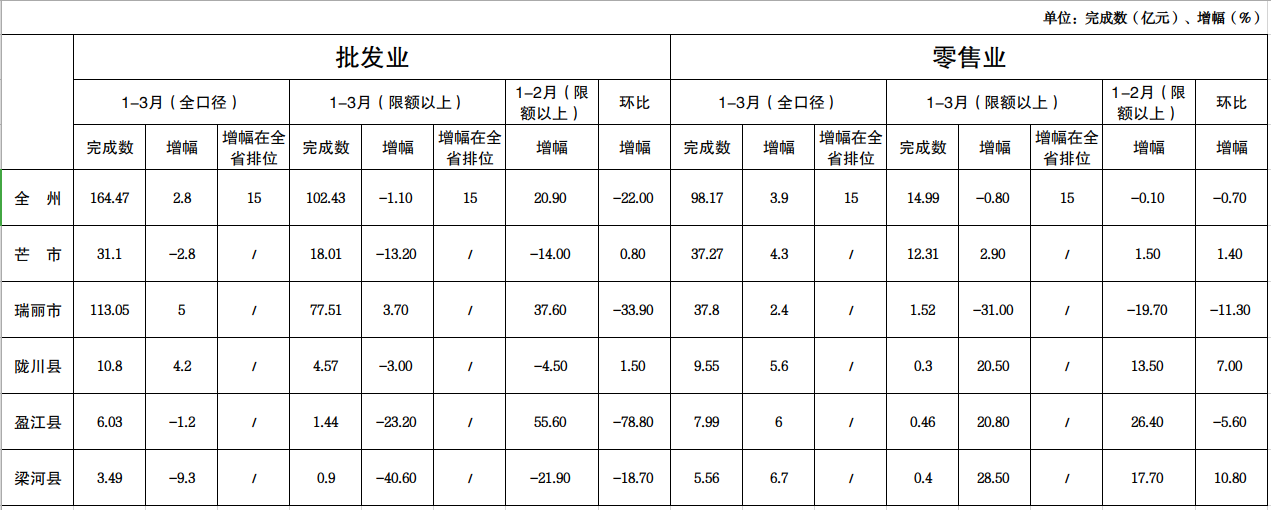 1、批发业分县市看:一是全口径瑞丽、陇川累计正增长,芒市、盈江、梁河累计负增长;二是限额以上瑞丽累计正增长,芒市、陇川、盈江、梁河累计负增长。