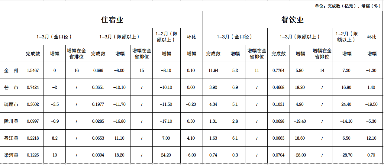 3、住宿业分县市看:一是全口径盈江、梁河累计正增长,芒市、瑞丽、陇川累计负增长;二是限额以上盈江、梁河累计正增长,芒市、瑞丽、陇川累计负增长。