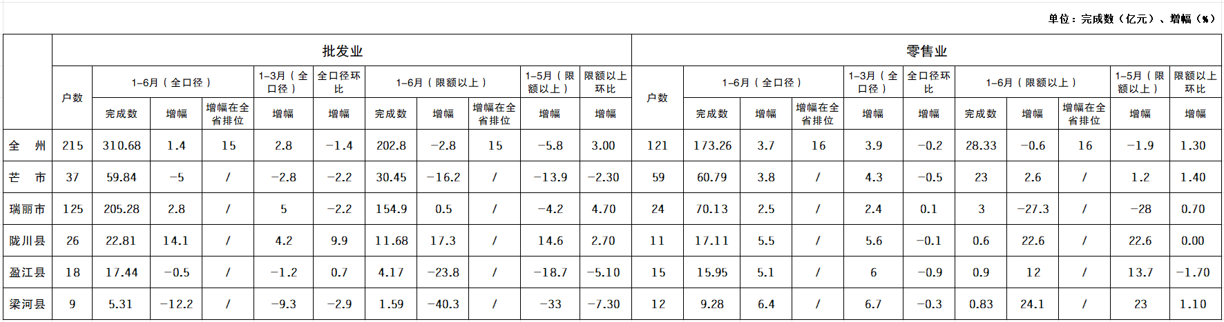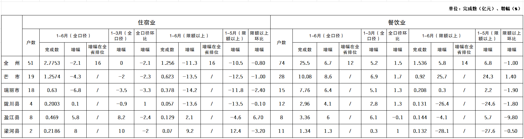 三、全州及各县市批零住餐业1—6月销售额完成情况