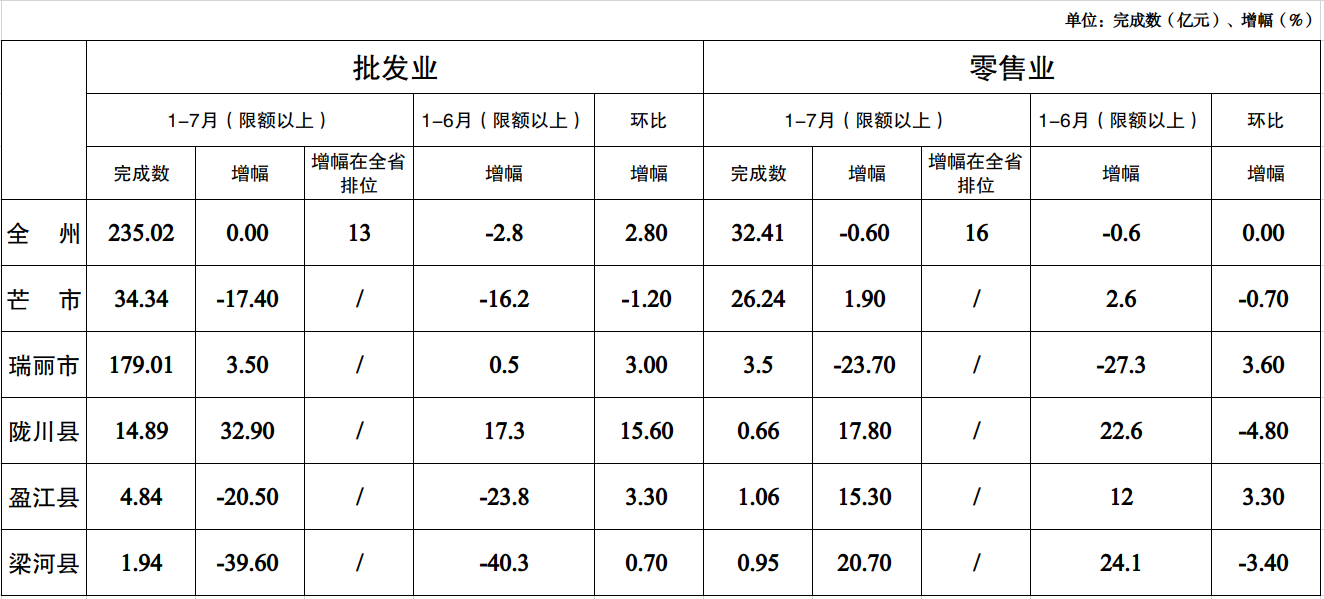 2、零售业分县市看:芒市、陇川、盈江、梁河累计正增长,瑞丽累计负增长;环比1-6月,盈江持续增长,芒市、陇川、梁河增长放缓,瑞丽降幅收窄。