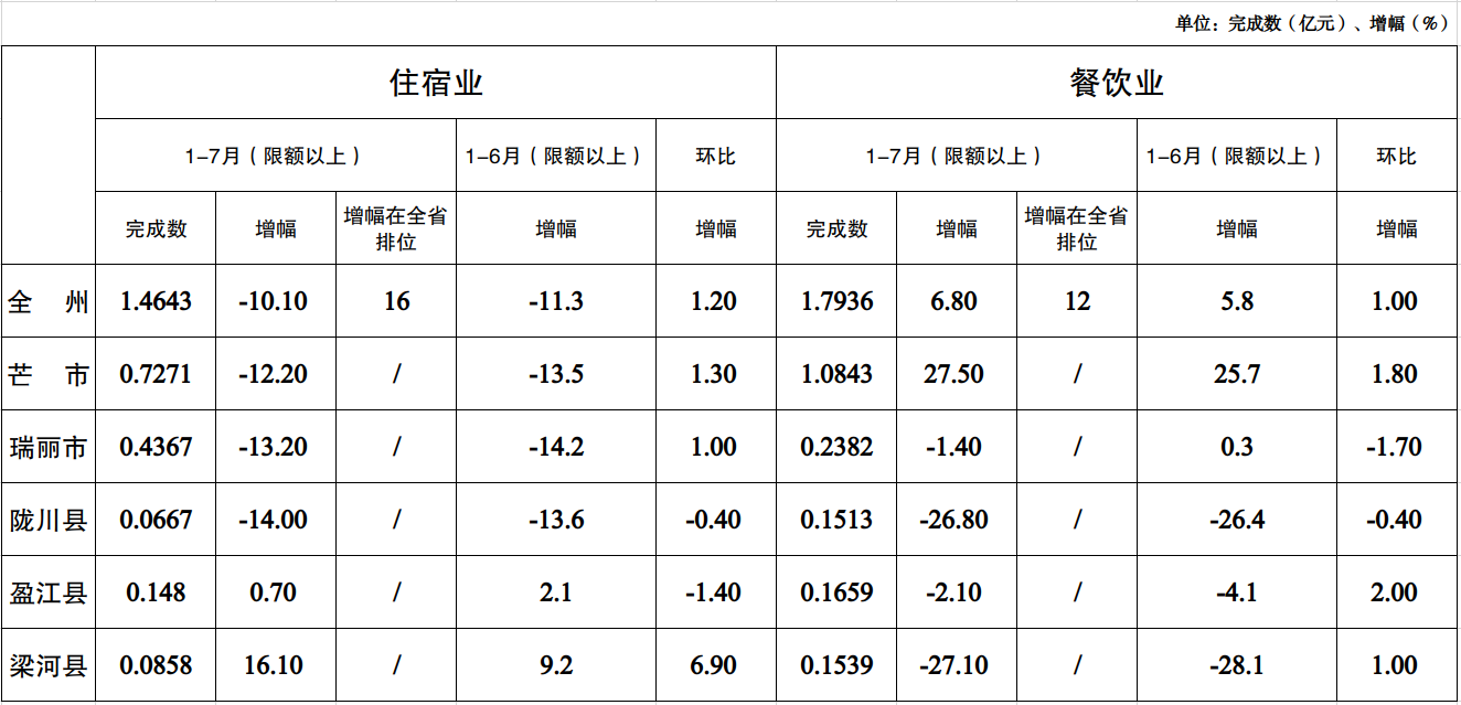 3、住宿业分县市看:盈江、梁河累计正增长,芒市、瑞丽、陇川累计负增长;环比1-6月,梁河持续增长,盈江增长放缓,芒市、瑞丽降幅收窄,陇川降幅扩大。