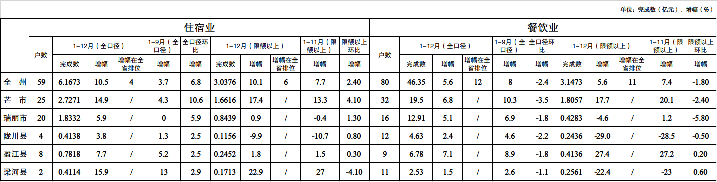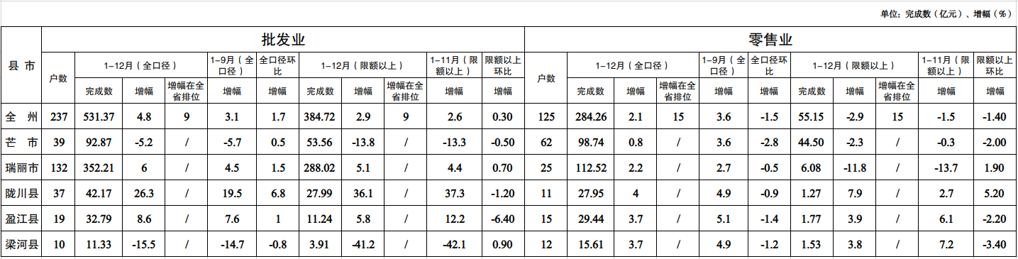 三、全州及各县市批零住餐业1—12月销售额完成情况