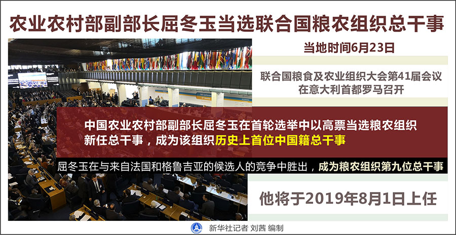 当日,屈冬玉在与来自法国和格鲁吉亚的候选人的竞争中胜出,成为粮农组织第九位总干事。他将于今年8月1日上任。