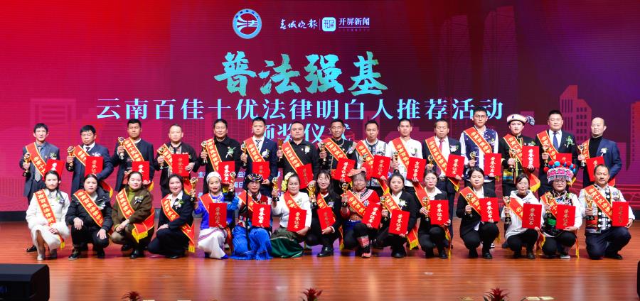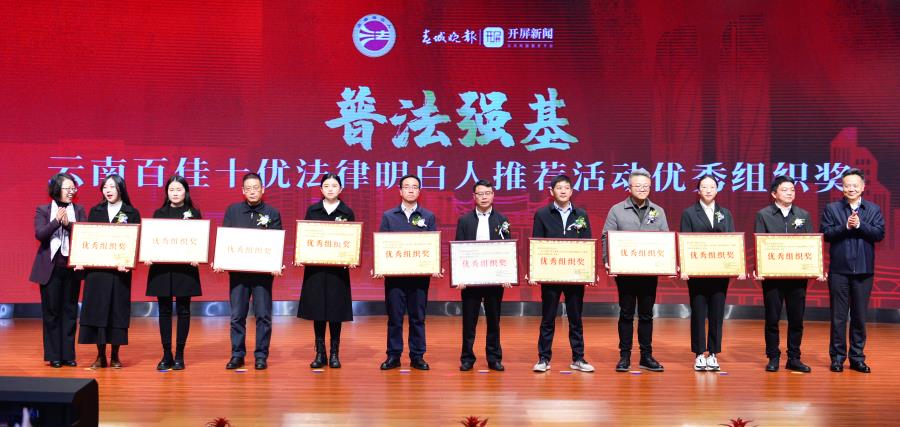 12月28日,由中共云南省委宣传部、云南省司法厅、云南省普及法律常识办公室、云南日报报业集团、云南报业传媒(集团)有限责任公司联合主办,春城晚报-开屏新闻承办的“普法强基·云南百佳十优法律明白人”推荐活动颁奖仪式在昆明市云报传媒广场举行。云南省文明办专职副主任郑义,中共云南省委政法委委员、政治部主任毛亚芳,云南省司法厅党委委员、副厅长彭国军,云南省乡村振兴局二级巡视员张庆,云南报业传媒(集团)有限责任公司副总经理李阳喜出席颁奖仪式,省委宣传部、省委政法委、省司法厅、省普法办、省民政厅、省农业农村厅、省乡村振兴局等省级部门有关处室负责同志参加活动。