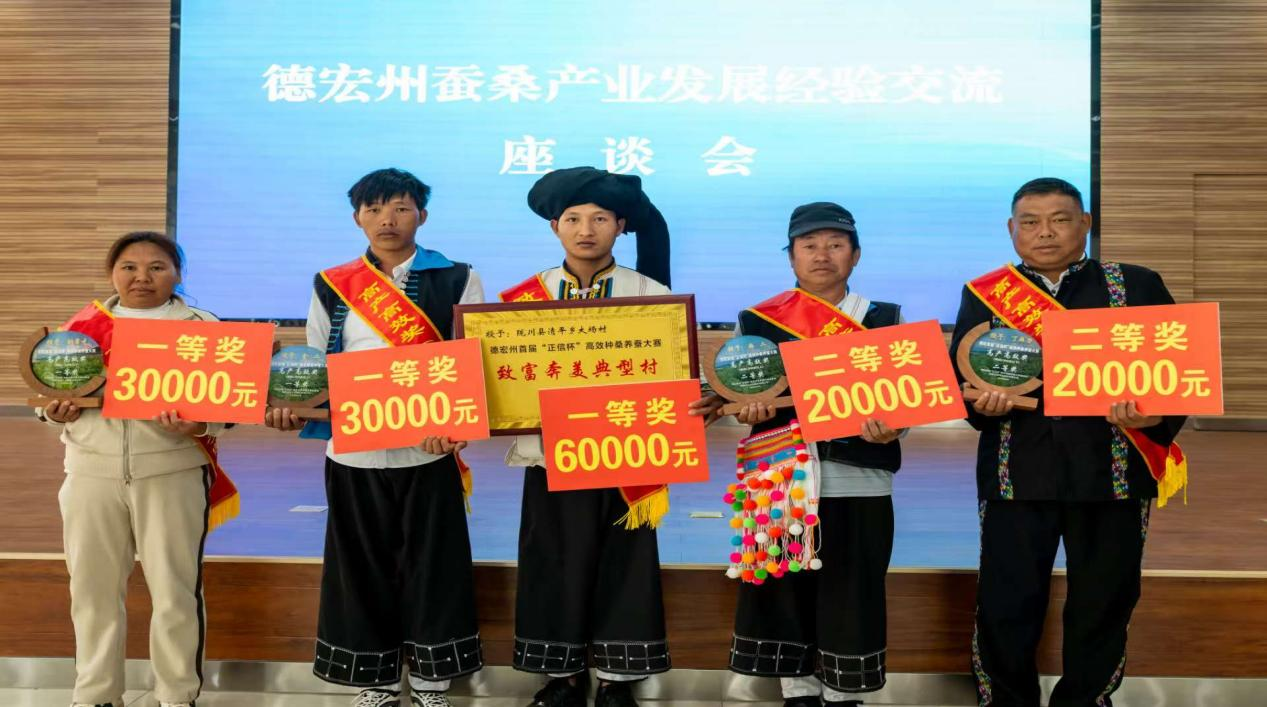 赵家寨村驻村工作队深入践行"头雁领航"工程,协同村党总支深挖大寨村民小组资源禀赋,借“党员联户”讲政策、析前景,以组织优势破解产业升级难题,动员7户村民率先发展百亩连片桑园,同时积极争取34650元帮扶资金,助力百亩桑园茁壮成长。2024年,在党组织引领下,赵家寨村蚕桑产业飞跃发展,桑园扩至211.5亩,鲜茧产量21吨,产值107.3万元,户均4.3万元,亩产5073元。凭借突出成绩,赵家寨村5户蚕桑养殖户荣获德宏州蚕桑先进户,其中一等奖1户奖金3万元、三等奖1户奖金1万元、鼓励奖3户奖金每户5千元。这些荣誉不仅是对农户辛勤劳作的认可,更是党建引领产业发展的有力见证,实现"党建红"与"桑蚕绿"深度融合。