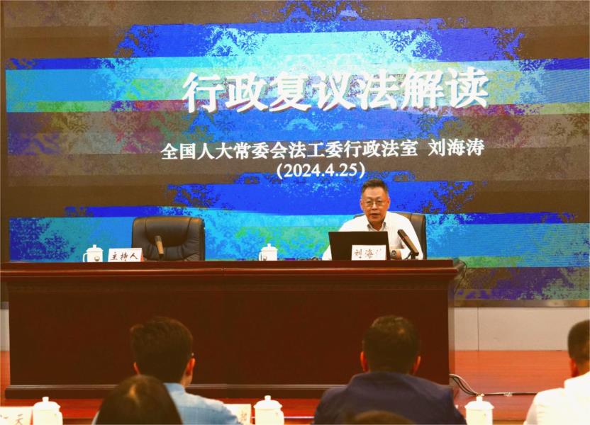 此次培训特邀全国人大常委会法制工作委员会行政法室副主任刘海涛作专题授课,省司法厅党委委员、副厅长胡江天主持培训并讲话。刘海涛副主任从行政复议总体情况,复议法修订的必要性、过程及意义,修法的整体思路,修法的主要内容等方面进行了系统深入地解读,特别在培训中对我省贯彻实施新法有关工作进行了总结和点评,深刻诠释了新法修订对于推进行政复议、行政执法工作高质量发展的重要地位和作用。