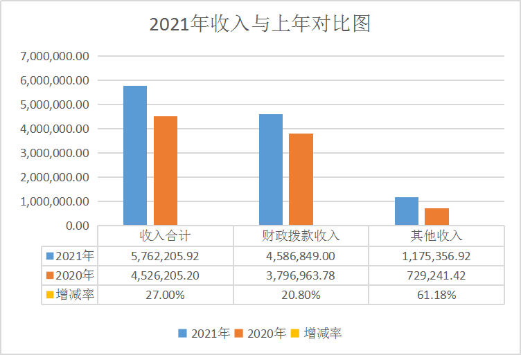 与上年对比增加123.60万元,增幅27.00%,其中:一般公共预算财政拨款较上年增加78.99万元,增幅20.80%;其他收入较上年增加44.61万元,增幅61.18%。主要原因为:2021年度省审计厅转拨省财政厅疫情防控工作经费和报刊杂志书籍征订费,财政拨款收入增加。地方财政安排投资审计项目,所以投资审计经费增加。