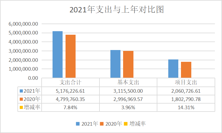 与上年对比支出增加37.65万元,增幅7.84%,其中基本支出增幅3.96%,项目支出增幅14.31%。主要原因是:2021年试用期3人转正,人员工资福利增加,所以基本支出增加;按照县委、县政府工作决策部署,2021年度投资审计项目增加,审计业务经费支出增加。